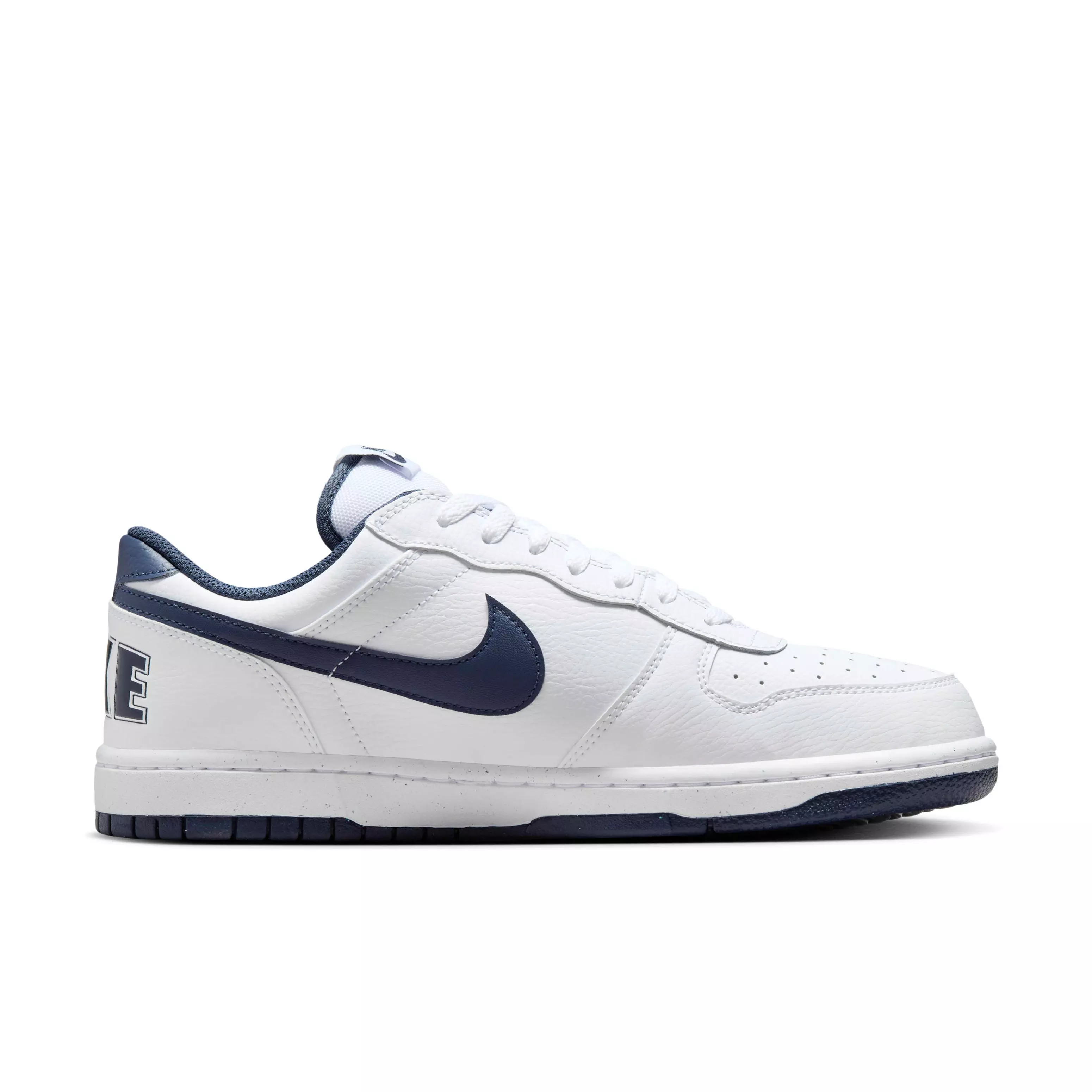 The Nike Big Low "White/Midnight Navy" Men's Shoe delivers a sleek look with leather on the upper and stitched-down overlays.Features
