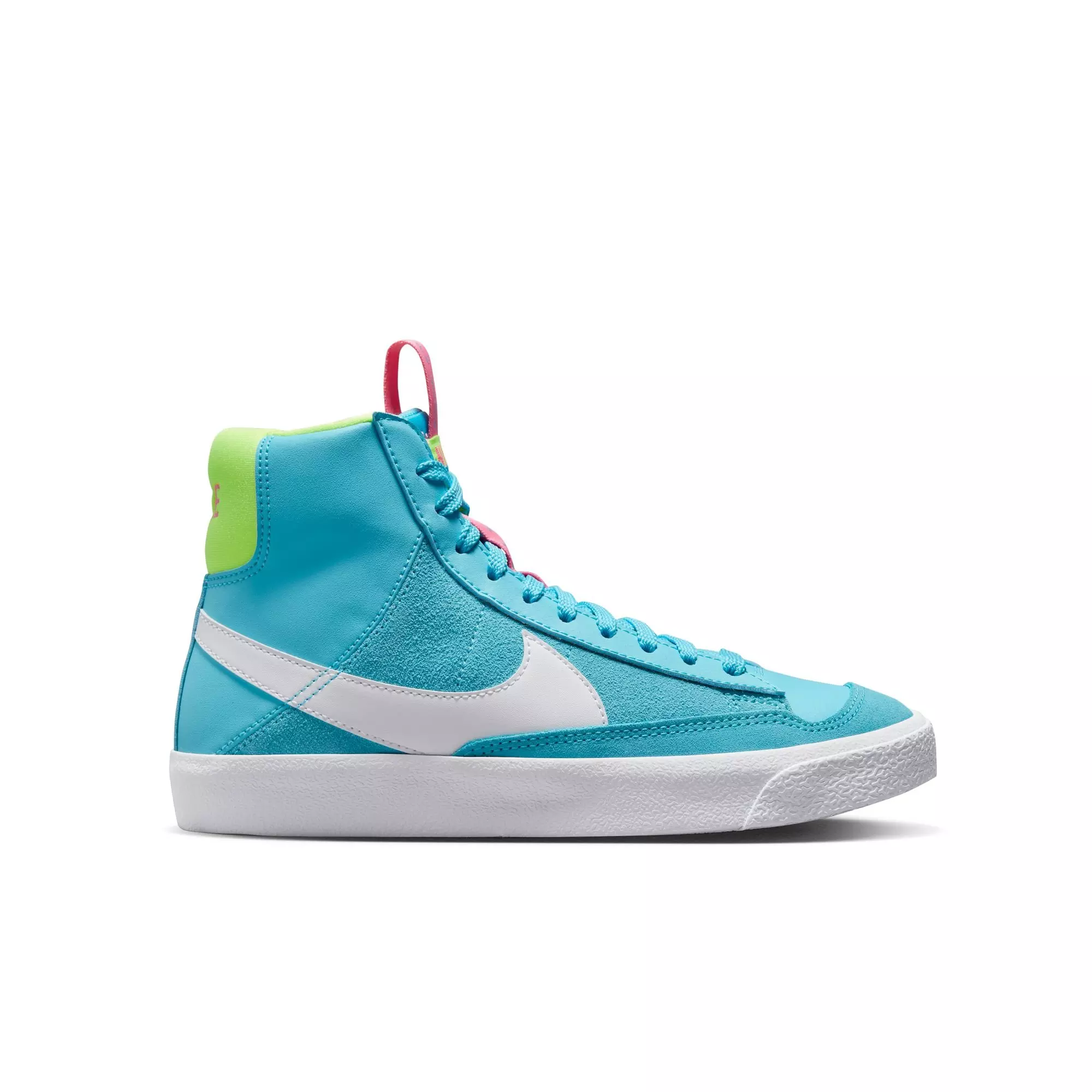 The Nike Blazer Mid '77 "Baltic Blue/White/Pink Glow/Volt" Grade School Girls' Shoe is all about getting your groove on. Start 2-stepping in soft suede and a mid-top style that helps you feel fun and fearless—wherever the beat takes you. This special edition features a big Swoosh inspired by the reminder to always let your inner light shine bright, and don't forget to dance your heart out!