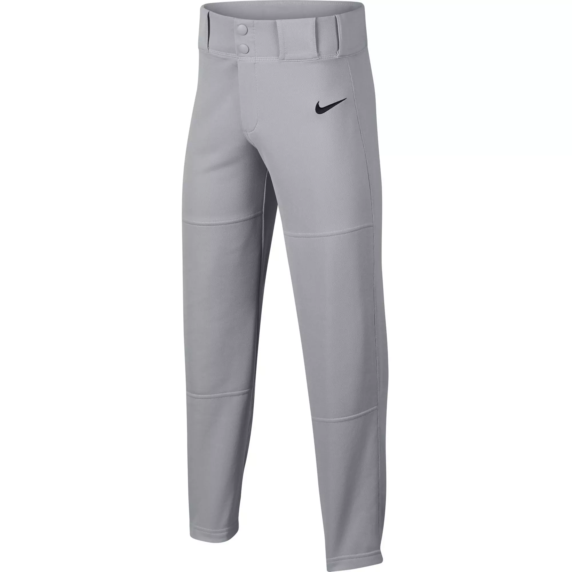 The Nike Boys' Core Open Hem Baseball Pants use durable knit fabric with reinforced knees to handle sliding and impact. The brass zipper and two metal snaps deliver a secure fit and quick closure.