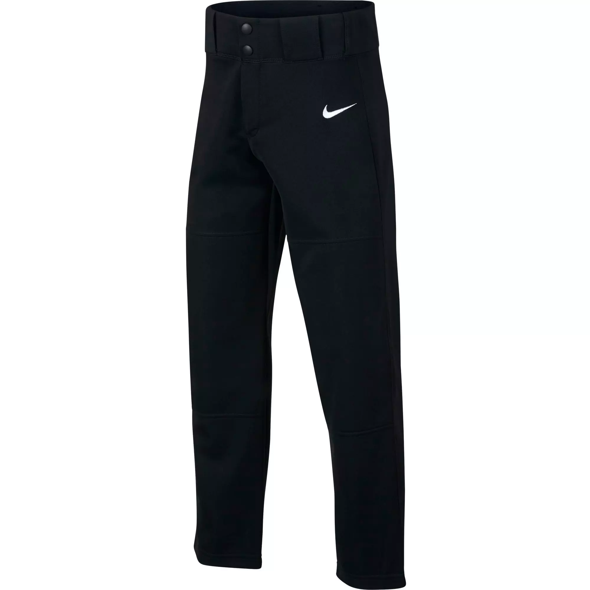 The Nike Boys' Core Open Hem Baseball Pants use durable knit fabric with reinforced knees to handle sliding and impact. The brass zipper and two metal snaps deliver a secure fit and quick closure.