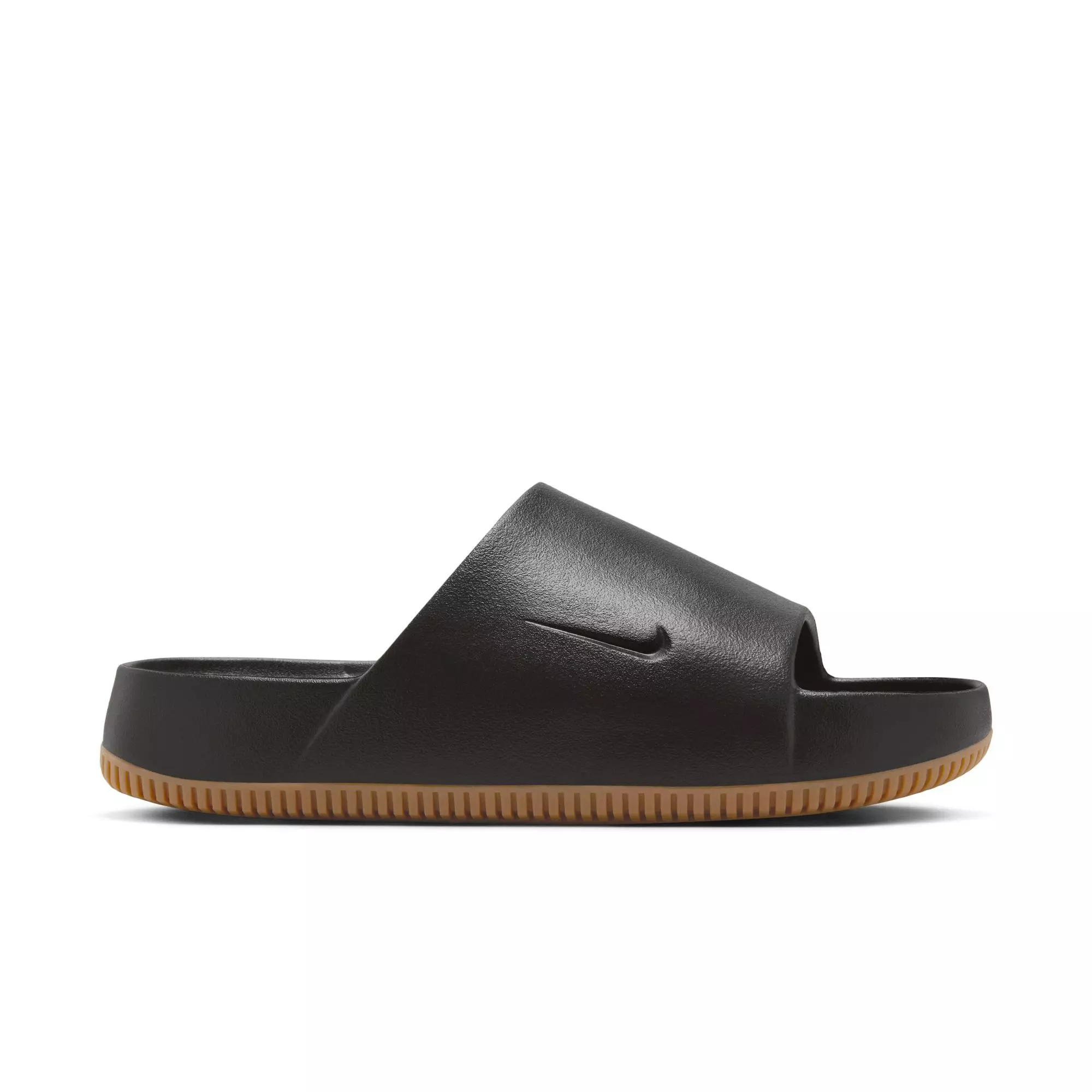 The Nike Calm "Black/Gum Med Brown" Men's Slide features soft, responsive foam that cushions each step. Its lightweight design packs easily and adapts to every setting, from urban streets to lunch breaks by the water.