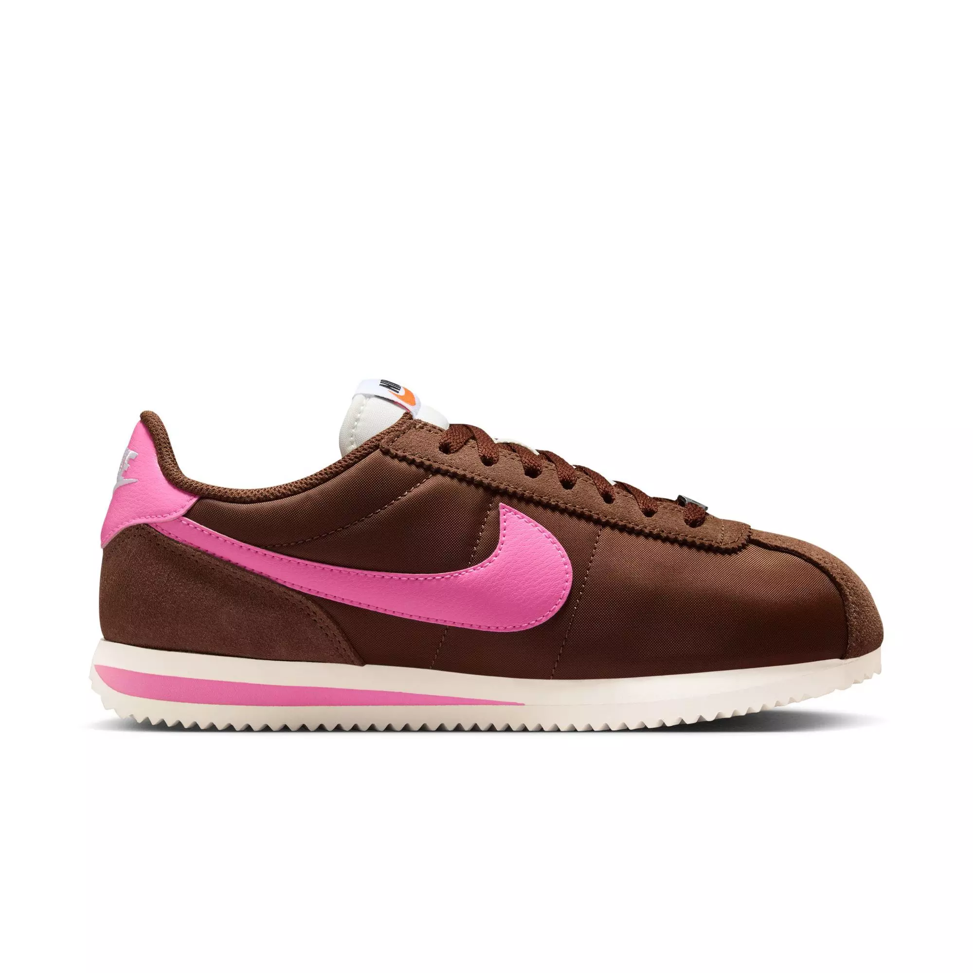Revamped for everyday comfort, the Nike Cortez "Fauna Brown/Pink Spell/Sail/White" Women's Shoe updates the iconic profile with a wider toe area and firmer side panels for a more secure fit. Reengineered textile helps resist warping and creasing while preserving the timeless look you love.
