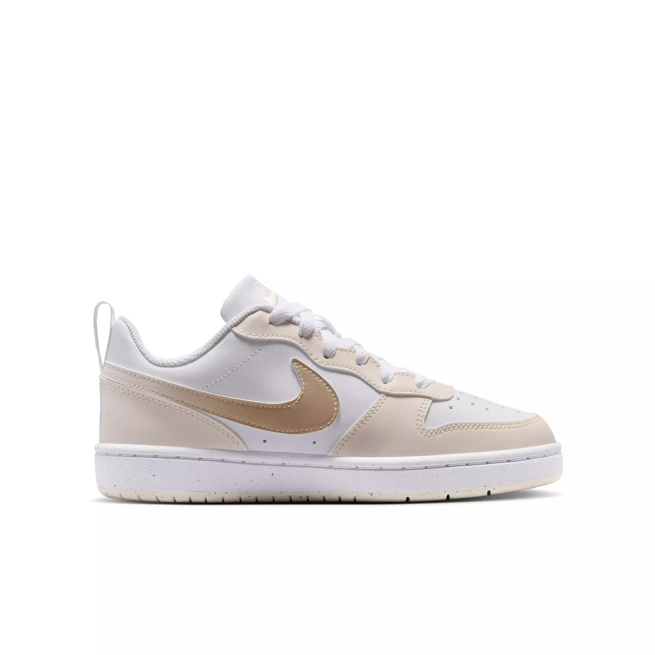 Inspired by retro-hooping style, the Nike Court Borough Low "White/Chalk/White/Shimmer" Grade School Girls' Shoe is made with synthetic leather for an old-school feel and reimagined with modern comfort, like extra room in the toe.Features