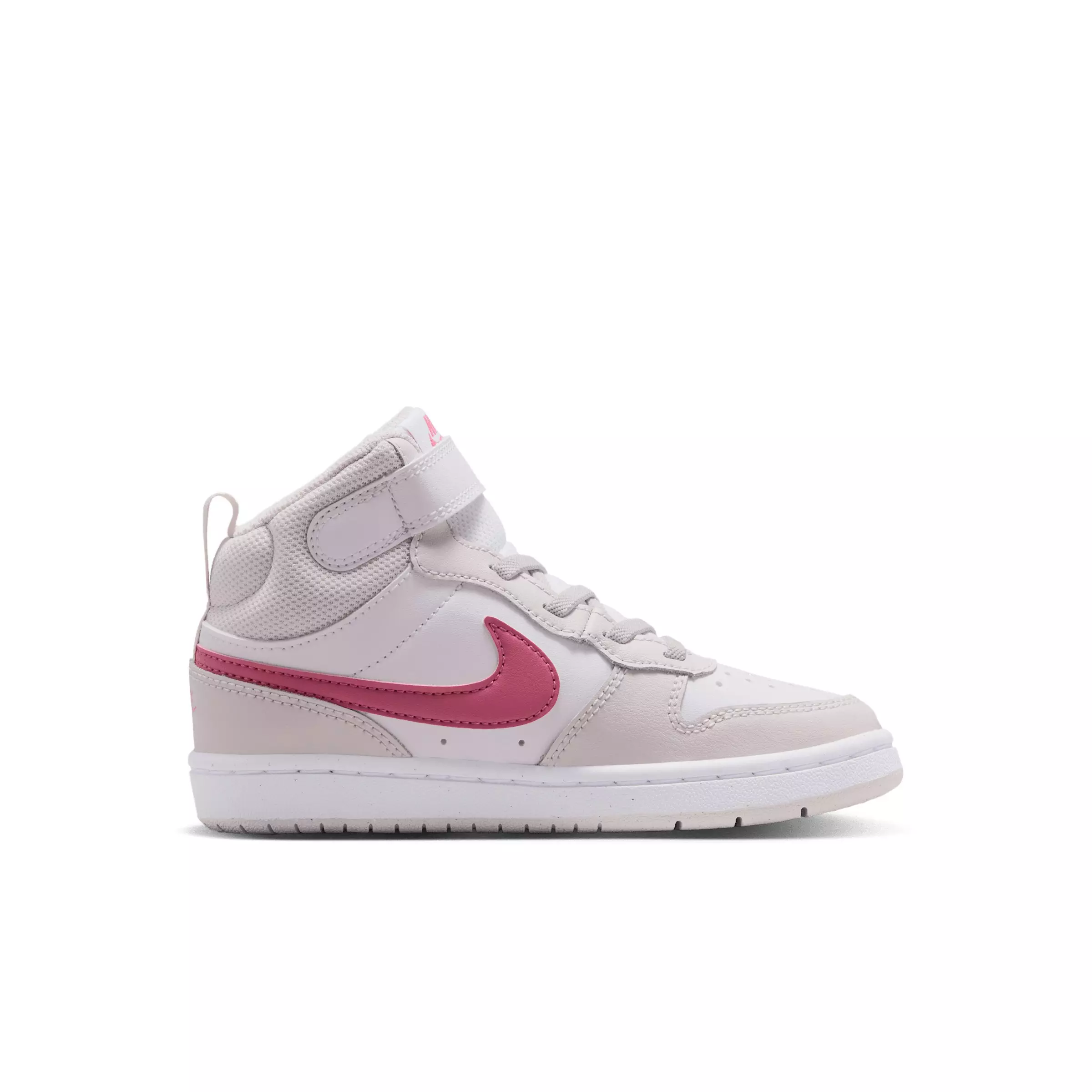 Your little one will feel like an all-star off the court with the Nike Court Borough Mid 2 "White/Vast Grey/White/Peony" Preschool Girls' Shoe. The classic mid-top design features durable leather for a premium look and feel. A hook-and-loop strap makes it easy to take the shoe on and off.Features