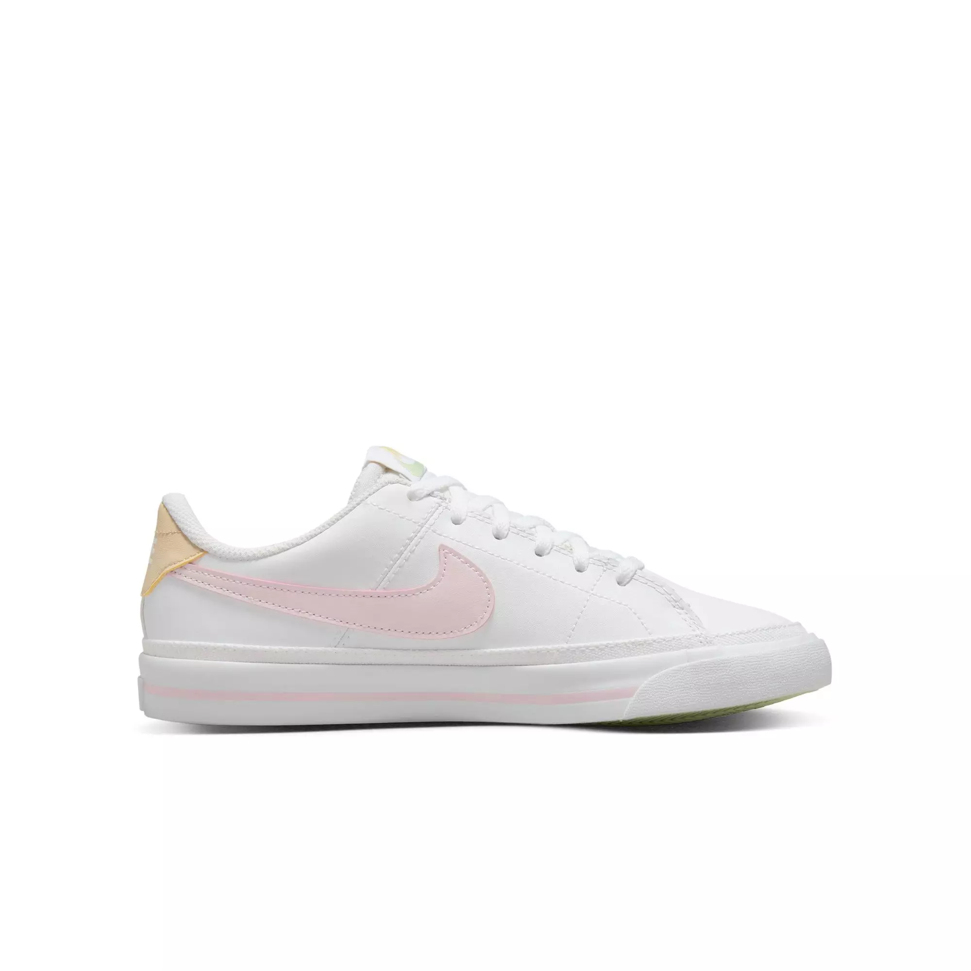 OLD-SCHOOL TENNIS CULTURE. The Nike Court Legacy "White/Pink Foam/Sesame/Honeydew" Grade School Girls' Shoe serves up style rooted in tennis culture. They are durable and comfy with heritage stitching and a retro Swoosh. When you pull these on—it’s game, set, match.Features