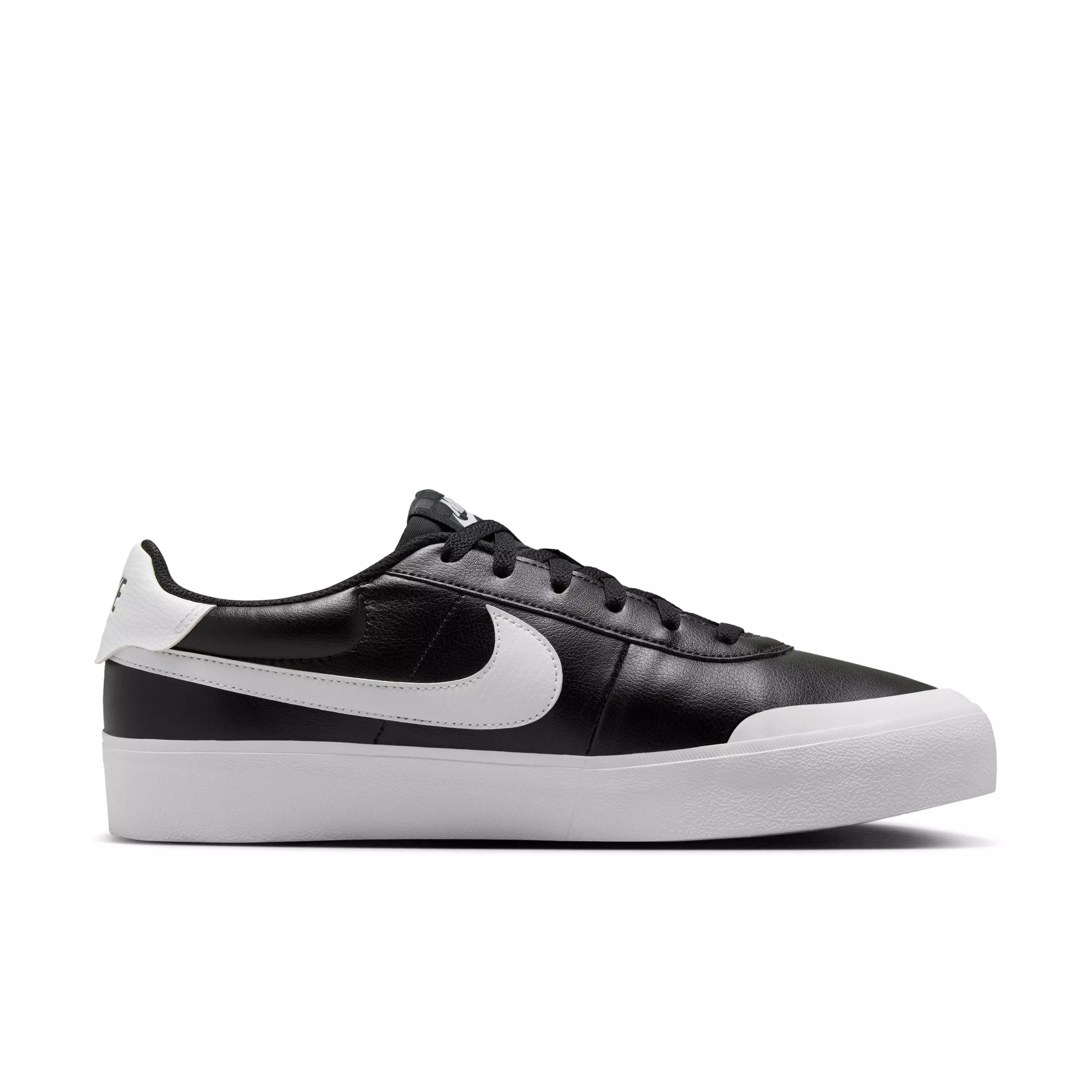 The Nike Court Shot "Black/White" Men's Shoe delivers a low-profile silhouette and features a synthetic leather upper that creates a classic look. Stitching reinforces structure while a textured Swoosh logo adds elevated detail and depth.