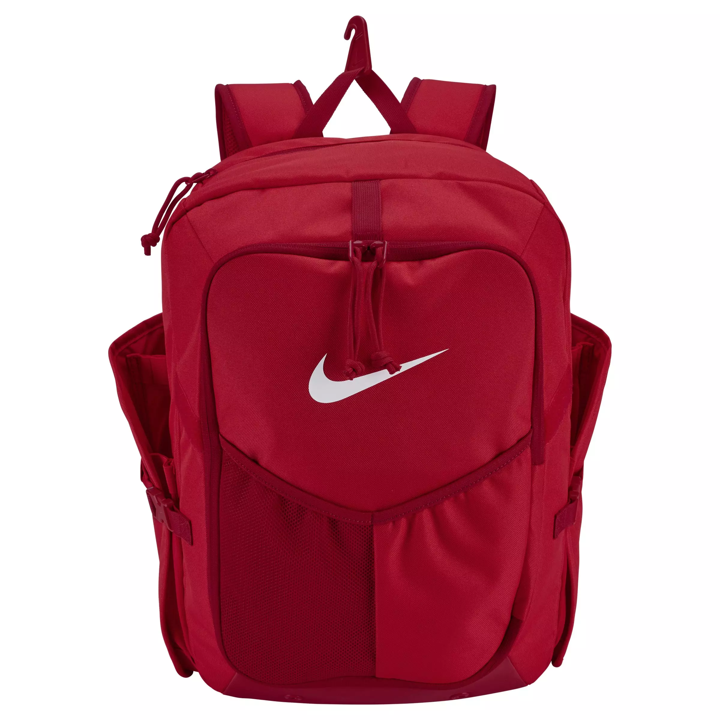 The Nike Diamond Select Baseball Bat Backpack - Red features a zippered main compartment that holds a mitt and helmet. On each side, two sleeves secure up to four bats total.