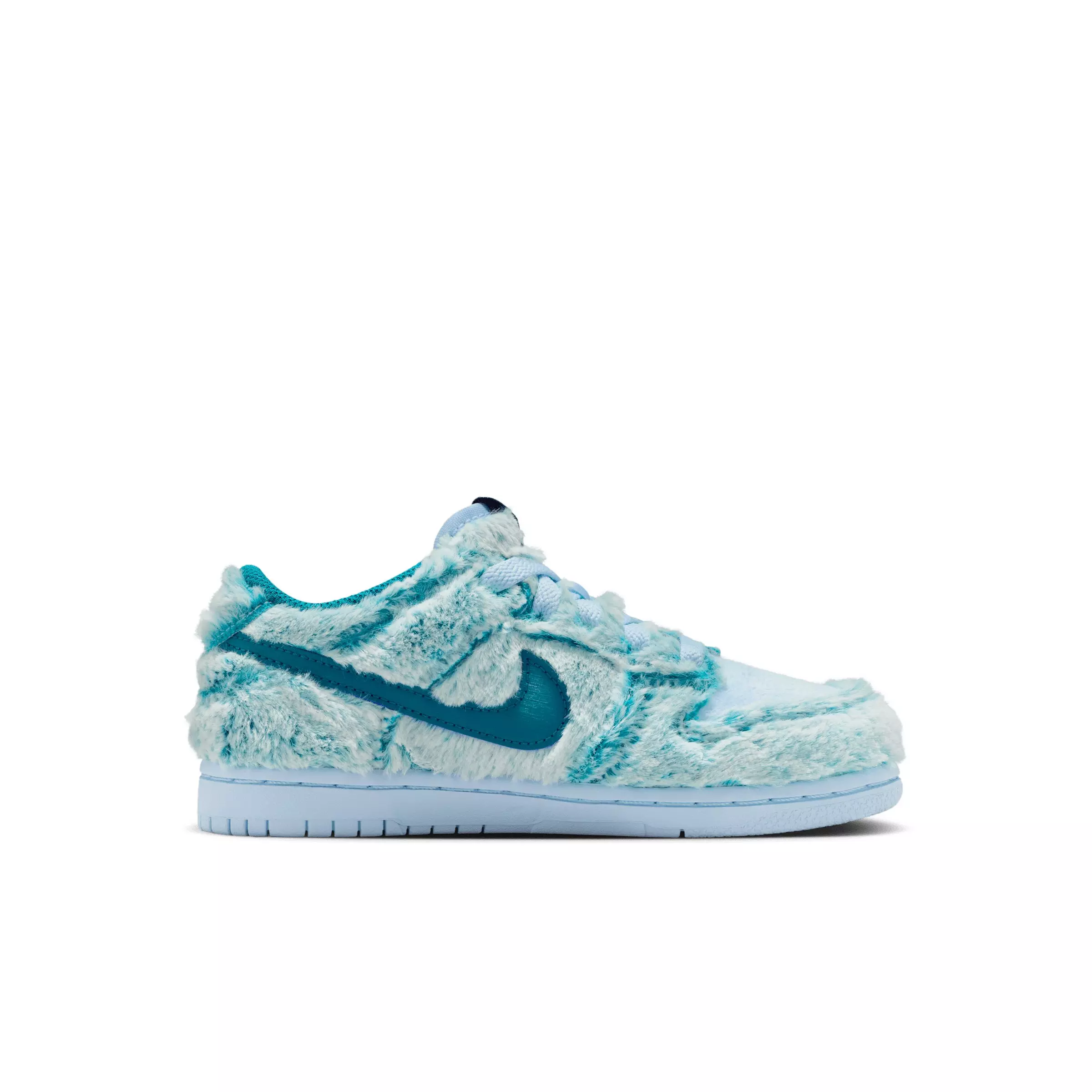 Yeti... Set... Dunk! The court classic dons a fuzzy upper in this special edition of the Nike Dunk Low "Celestine Blue/White/Green Abyss" Preschool Boys' Shoe. Complete with a snowy Nike logo on the heel, plaid insole and even a stuffed monster keychain, your little one will have the coolest sneakers outside of the North Pole. Plus, a little something extra to add more chill to their favorite bag.Features