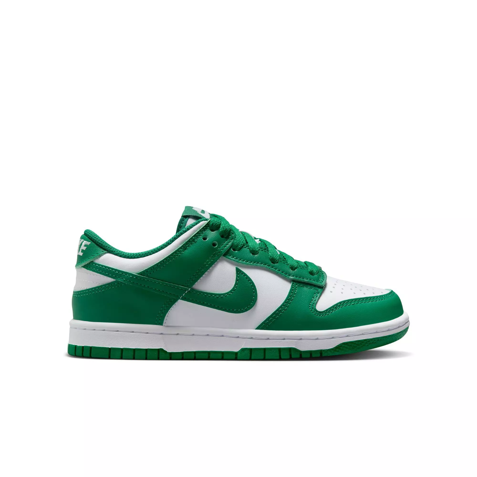 Built originally as a basketball silhouette and embraced by skateboarders, the Nike Dunk Low "White/Malachite" Grade School Boys' Shoe set the standard in sneaker culture. It features a padded collar and durable rubber traction that delivers reliable grip across every surface.