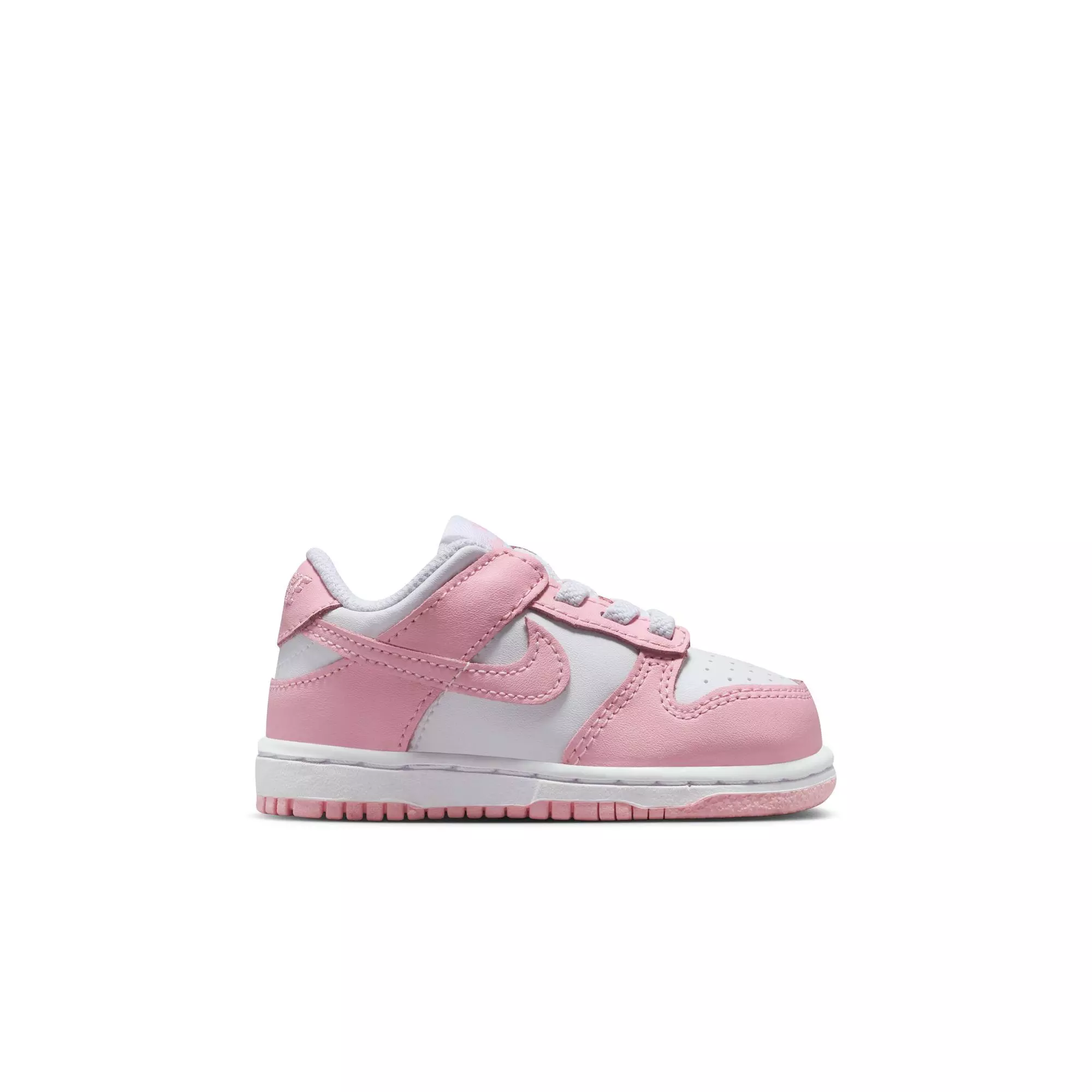 The Nike Dunk Low "White/Med Soft Pink" Toddler Girls' Shoe revived a classic basketball silhouette embraced by skate culture and helped define sneakerhead culture. Plush ankle padding cushions each step while durable rubber traction grips surfaces.