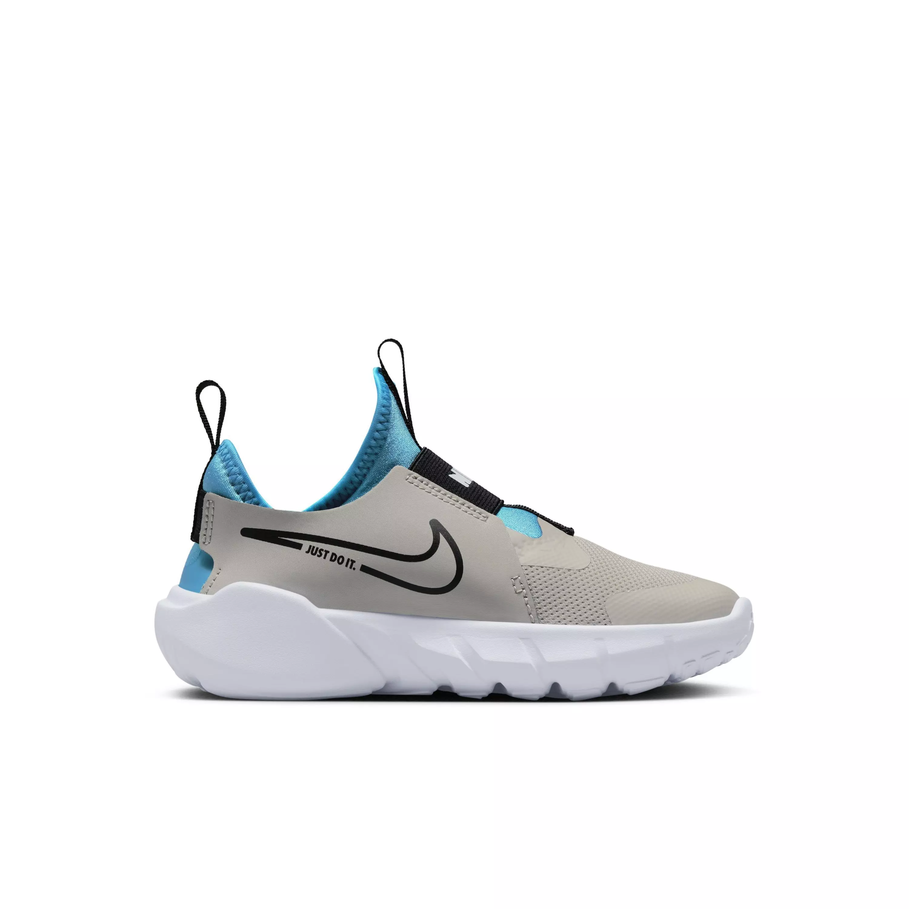 Ready for playtime, the Nike Flex Runner 2 "Light Iron Ore/Black/Blue Lightning/White" Preschool Boys' Running Shoe slips on easily with a stretchy, bootie-style upper and elastic midfoot straps that help keep little feet secure. Pull tabs at the heel and tongue make on-and-off fast for busy mornings and playground breaks.