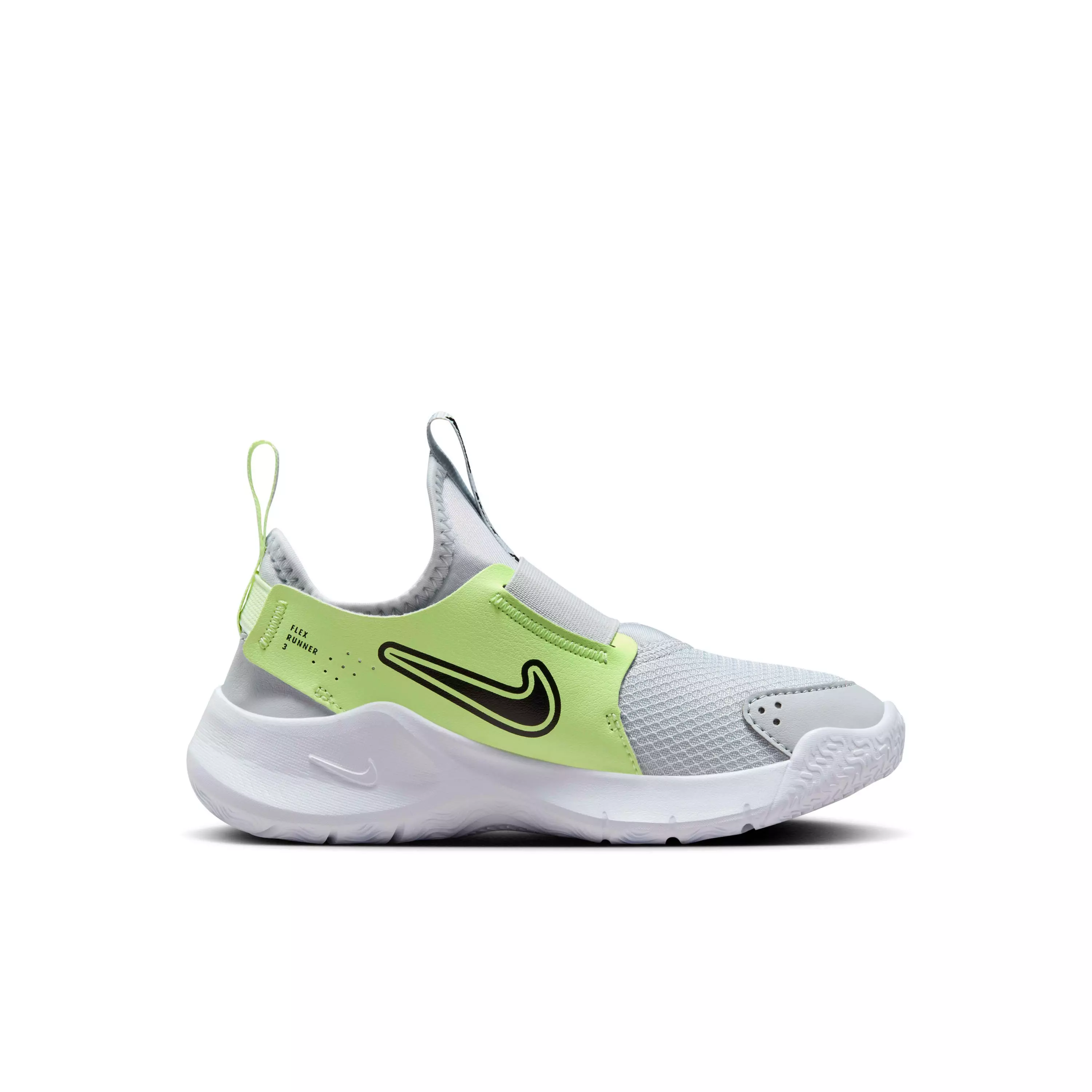 Made for nonstop play, the Nike Flex Runner 3 "Pure Platinum/Barely Volt/Black" Preschool Boys' Running Shoe combines an easy slip-on design with a snug, stretchy bootie. Leather overlays add durability in high-wear areas, so kids can get out the door fast.