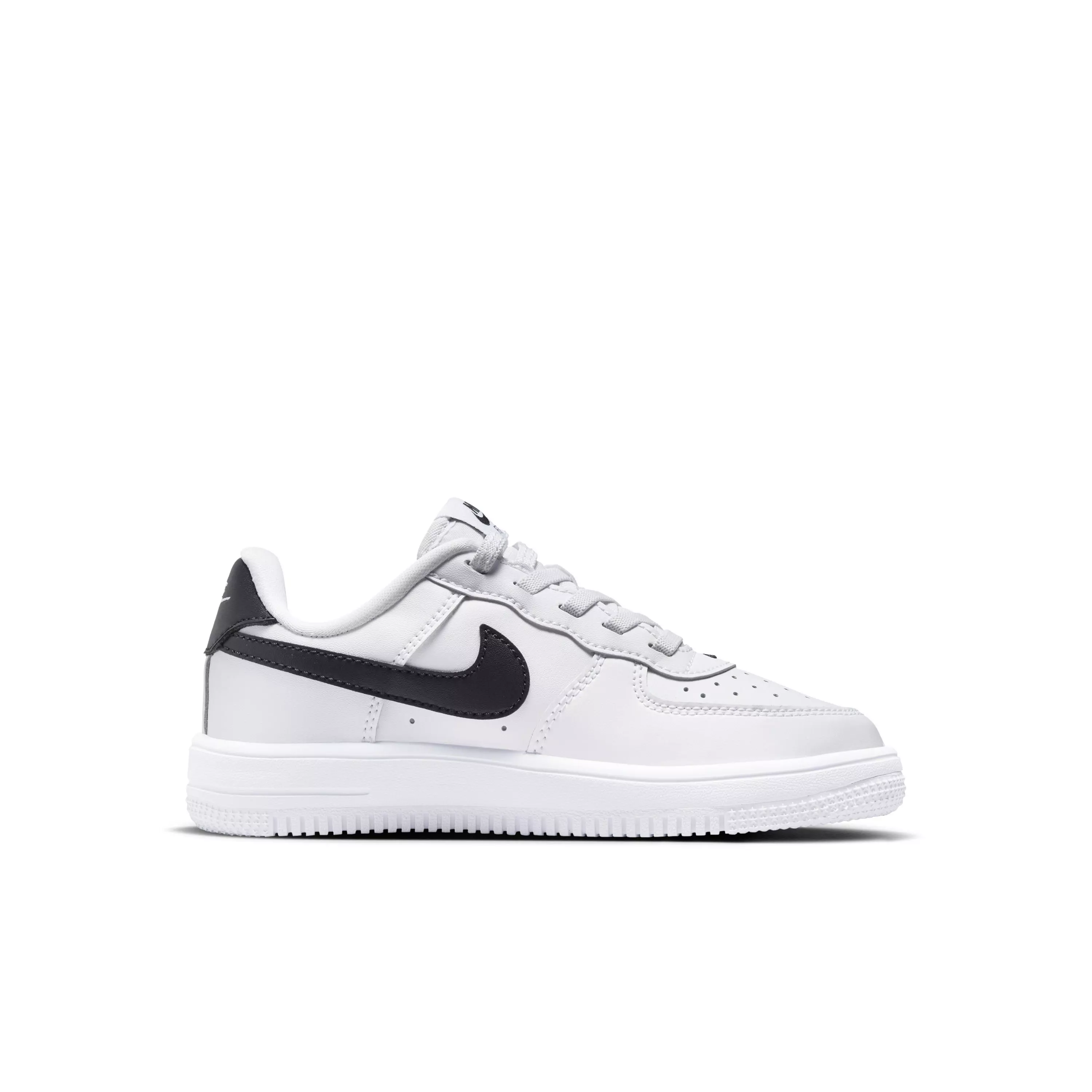 Meet the Nike Force 1 Low EasyOn "White/Black" Preschool Boys' Shoe, featuring decorative laces with a hidden hook-and-loop strap at the top two loops. Children secure them in seconds while preserving the classic AF1 silhouette.
