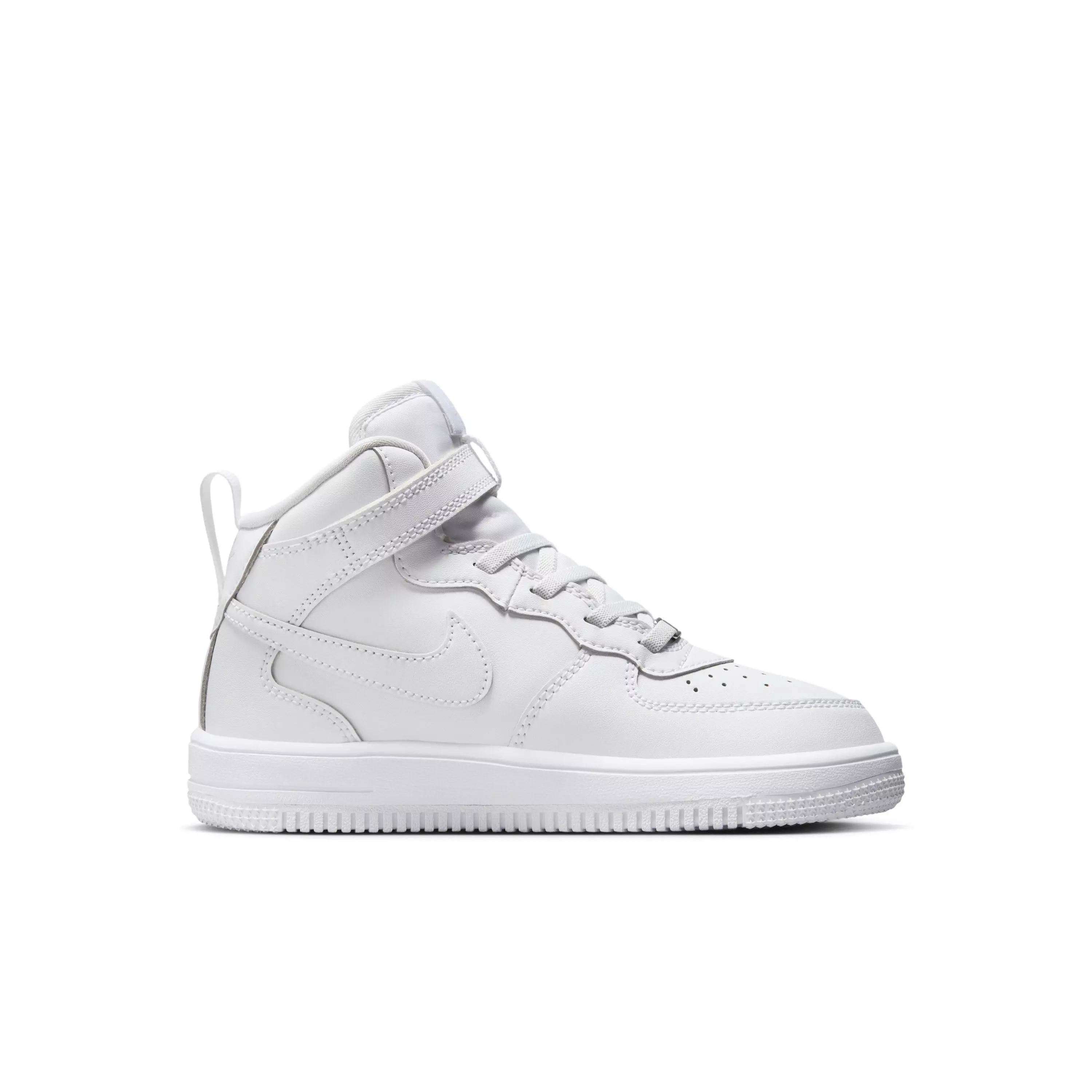 Sure, this looks like a classic AF1, but there's one very helpful difference. Can you spot it? Elastic laces and a wide opening help give kids a little extra room to slip these Nike Force 1 Mid EasyOn "White" Preschool Kids' Shoes on. The quick-to-secure strap helps lock in the fit, so kids are ready to play. Plus, a rubber outsole and padded mid-top collar add textbook AF1 durability and comfort.Features
