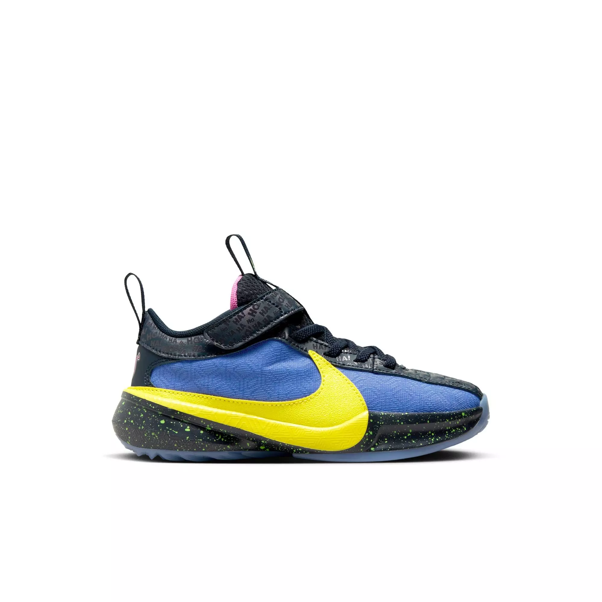 Watch your little MVP discover a new way to play in the Nike Freak 5 "Joker" Preschool Kids' Basketball Shoe. Flexibility in the forefoot helps them run, jump and find their footing on the court or playground with ease. Giannis' love of jokes inspired us to infuse these special edition shoes with a hearty dose of laughter. Plus, oversized loops on the heel and tongue help make it easy to pull them on and get going.Features
