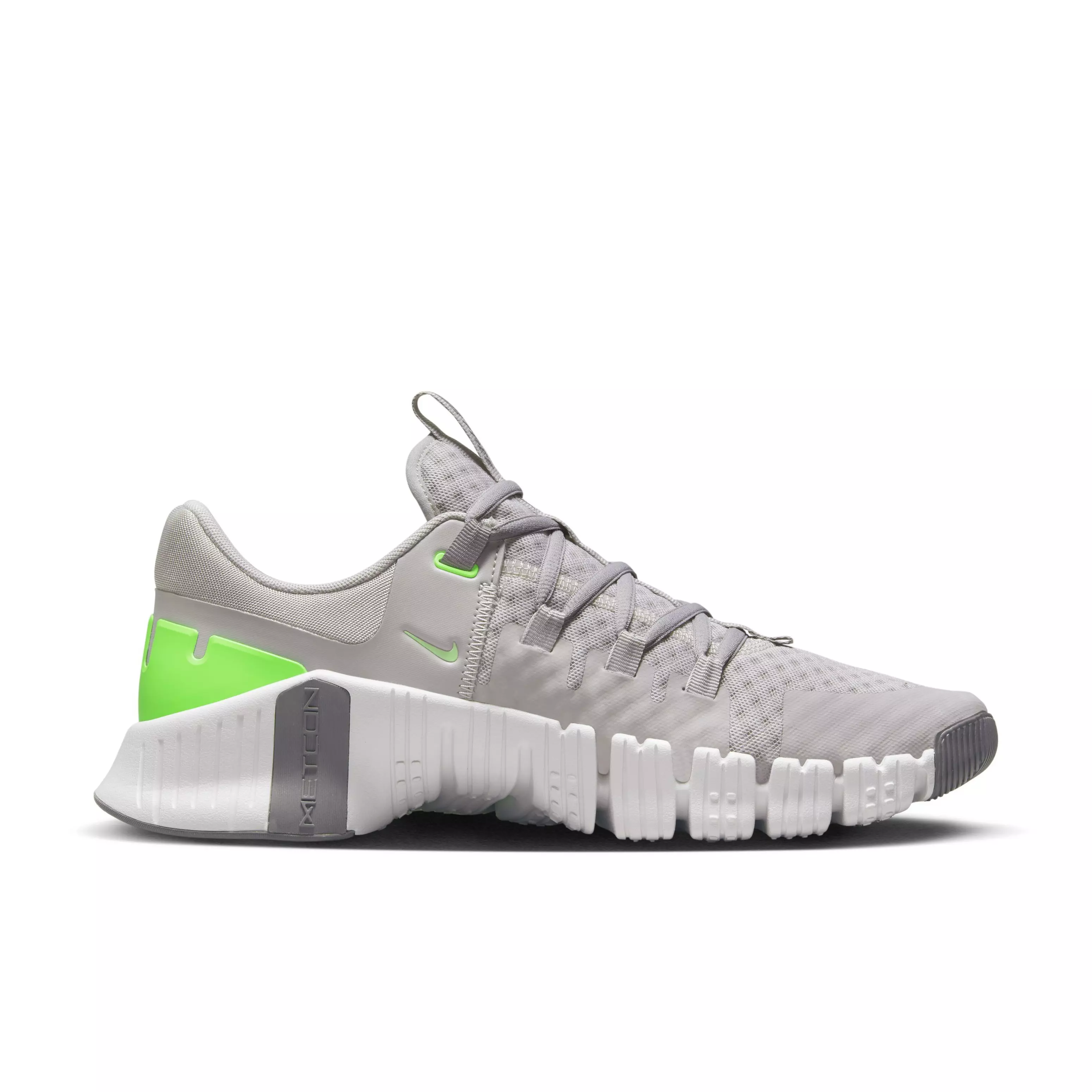 The Nike Free Metcon 5 "Light Iron Ore/Phantom/Flat Pewter/Green Strike" Men's Training Shoe features a revamped collar for easier on and off, plus a wide, stable base that supports heavy lifts without sacrificing natural movement during fast transitions.