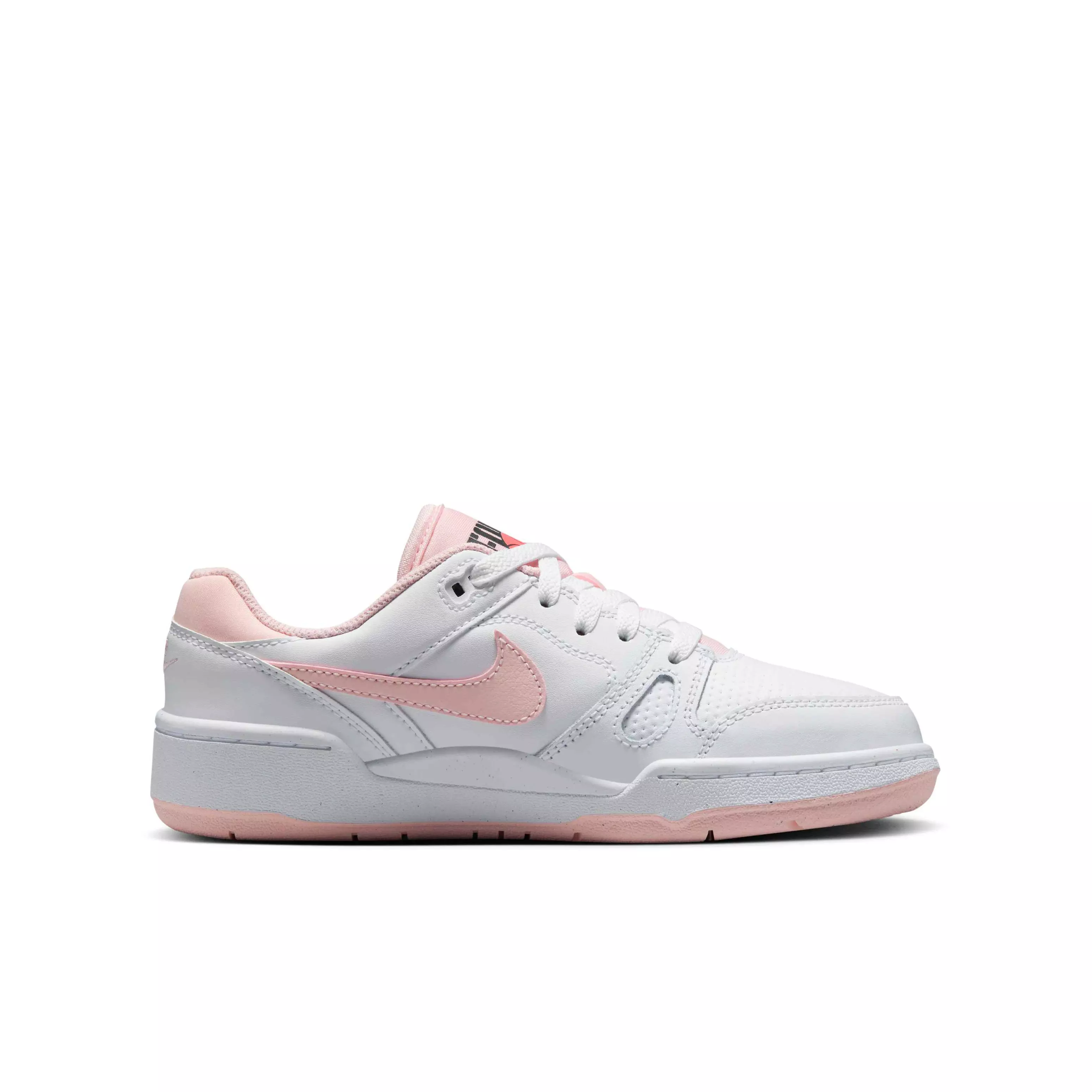 The Nike Full Force Low "White/Bright Mango/Black/Echo Pink" Grade School Girls' Shoe channels '80s style and nods to the AF1. Its retro silhouette brings nostalgic flair.