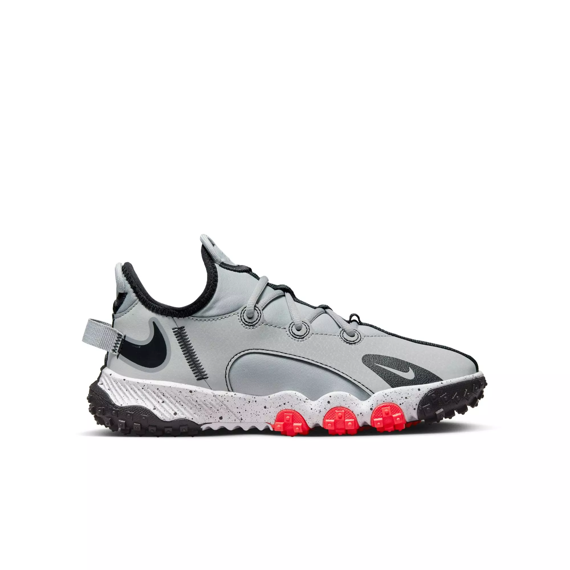Football, baseball, soccer, even recess play—Nike Future Field "Smoke Grey/Black/Bright Crimson/White" Grade School Boys' Baseball Shoe handles all field action. Durable construction stands up to hard use.