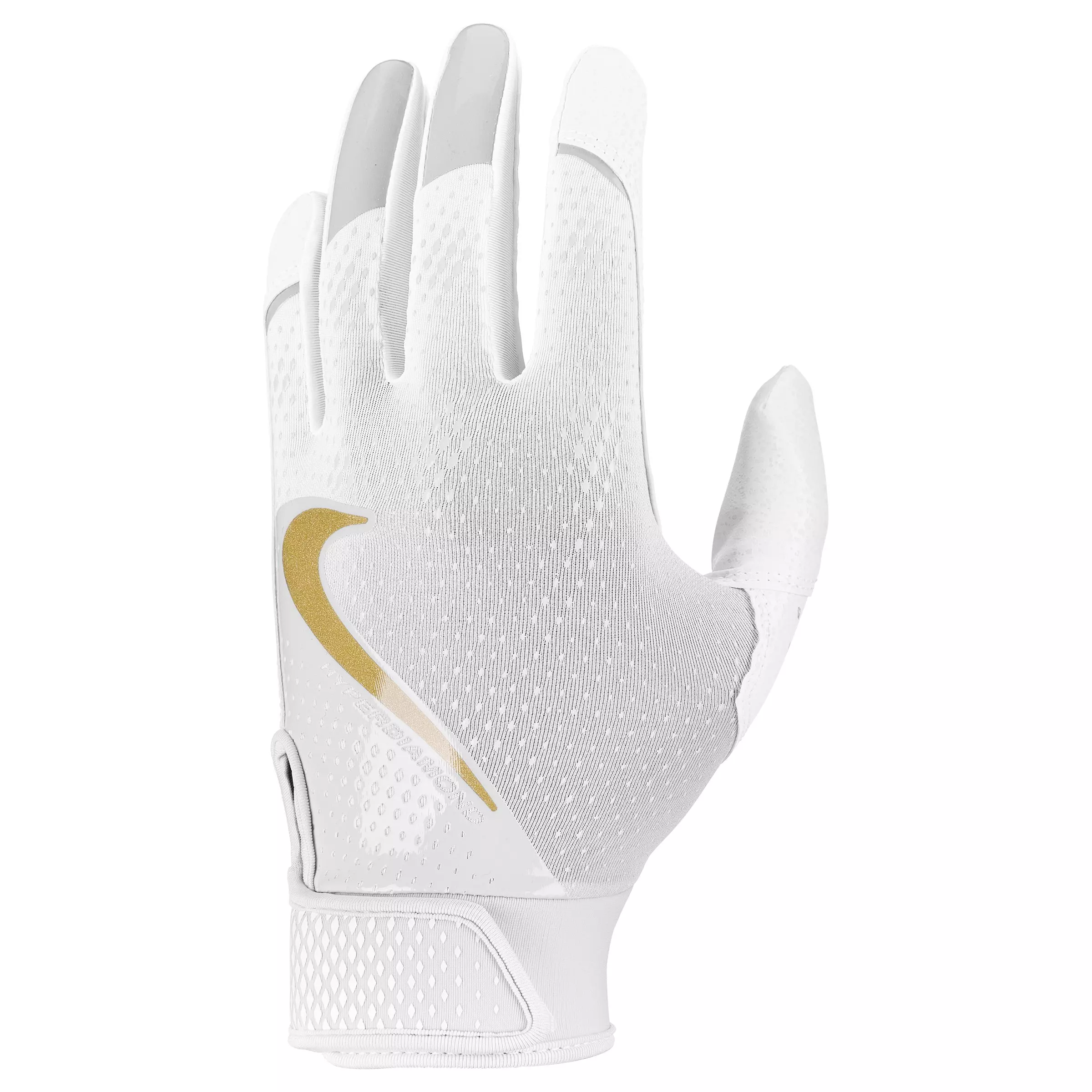The Nike Hyperdiamond 3.0 Softball Batting Gloves - White/Gold use textured leather at the palm to deliver superior grip and lasting durability. Textured leather resists wear season after season. A flexible overlay at the back eliminates bunching and ensures a smooth feel.