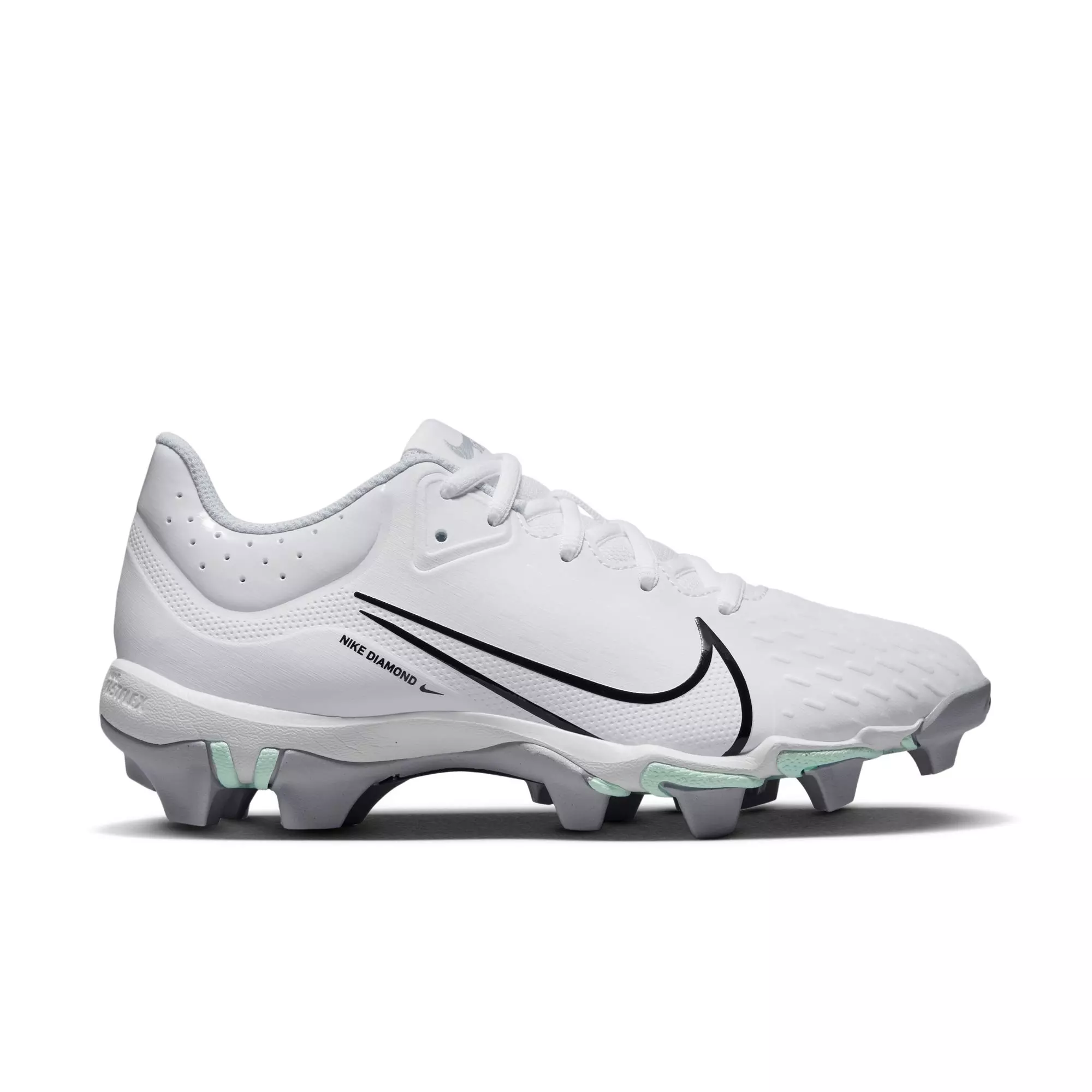 The Nike Hyperdiamond 4 Keystone "White/Black/Pure Platinum/Wolf Grey" Women's Softball Cleat is all about lightweight comfort on the diamond. Molded details on the upper add durability, while a flexible rubber sole with studs helps give you traction throughout the game or practice.Features
