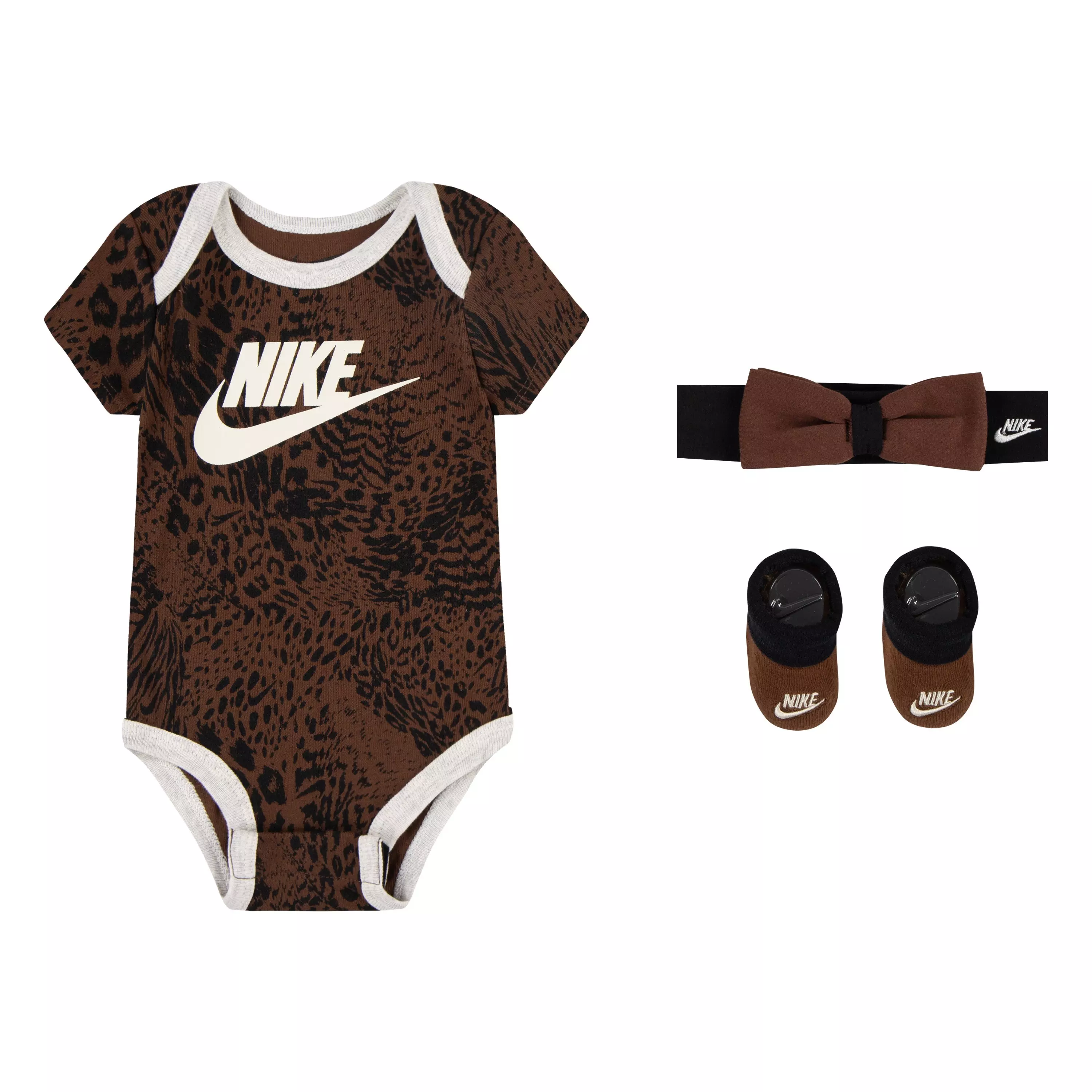 The Nike Infant Girls' Cacao WOW 3-Piece Set​ includes a short-sleeve cotton bodysuit, booties, and headband for matching, cozy comfort. The bodysuit has lap shoulders and snap closures to make changing and dressing easy.Features