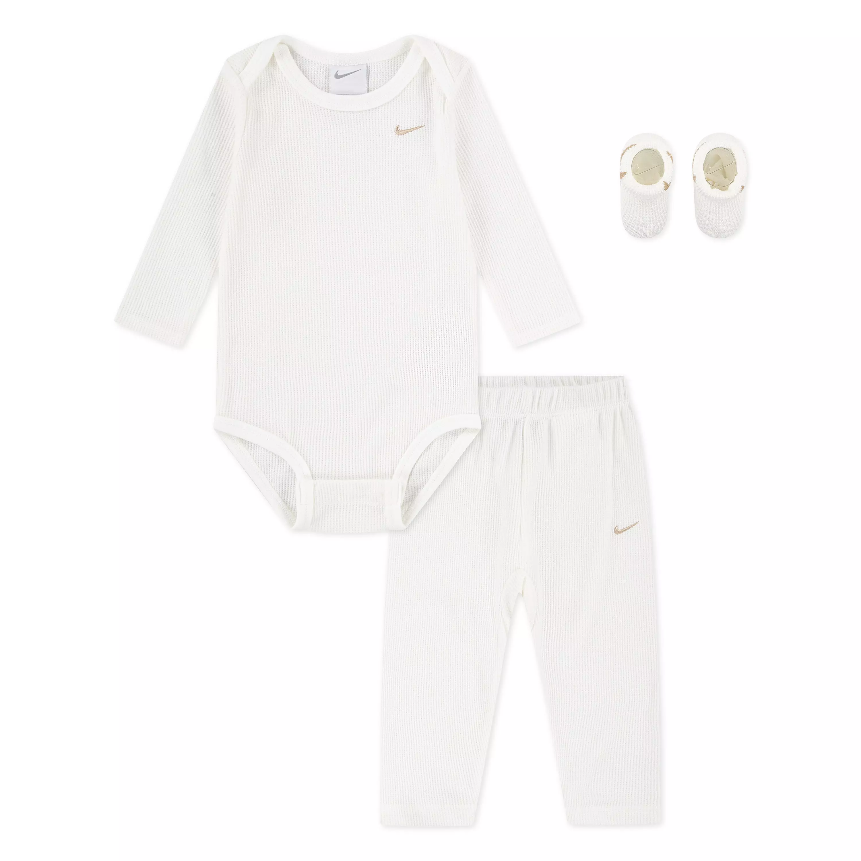 The Nike Infant Kids' Waffle 3-Piece Box Set - Sail keeps little ones cozy with a soft, waffled bodysuit featuring lapped shoulders and snap closures for quick changes. Coordinating pants and booties complete the outfit for an easy, put-together look.