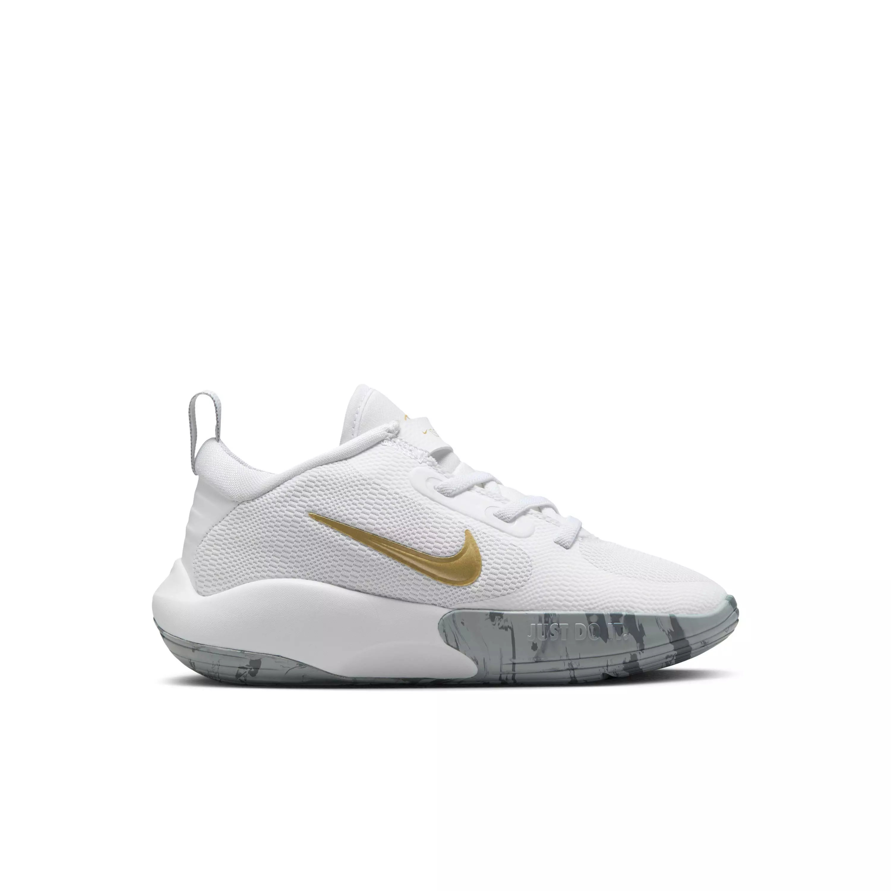 Slip on the Nike IsoFly "White/Cool Grey/Wolf Grey/Metallic Gold Star" Preschool Boys' Basketball Shoe and experience a lightweight, bouncy ride. Durable traction grips the ground on playground surfaces and hardwood courts, so your child stays steady during every move.
