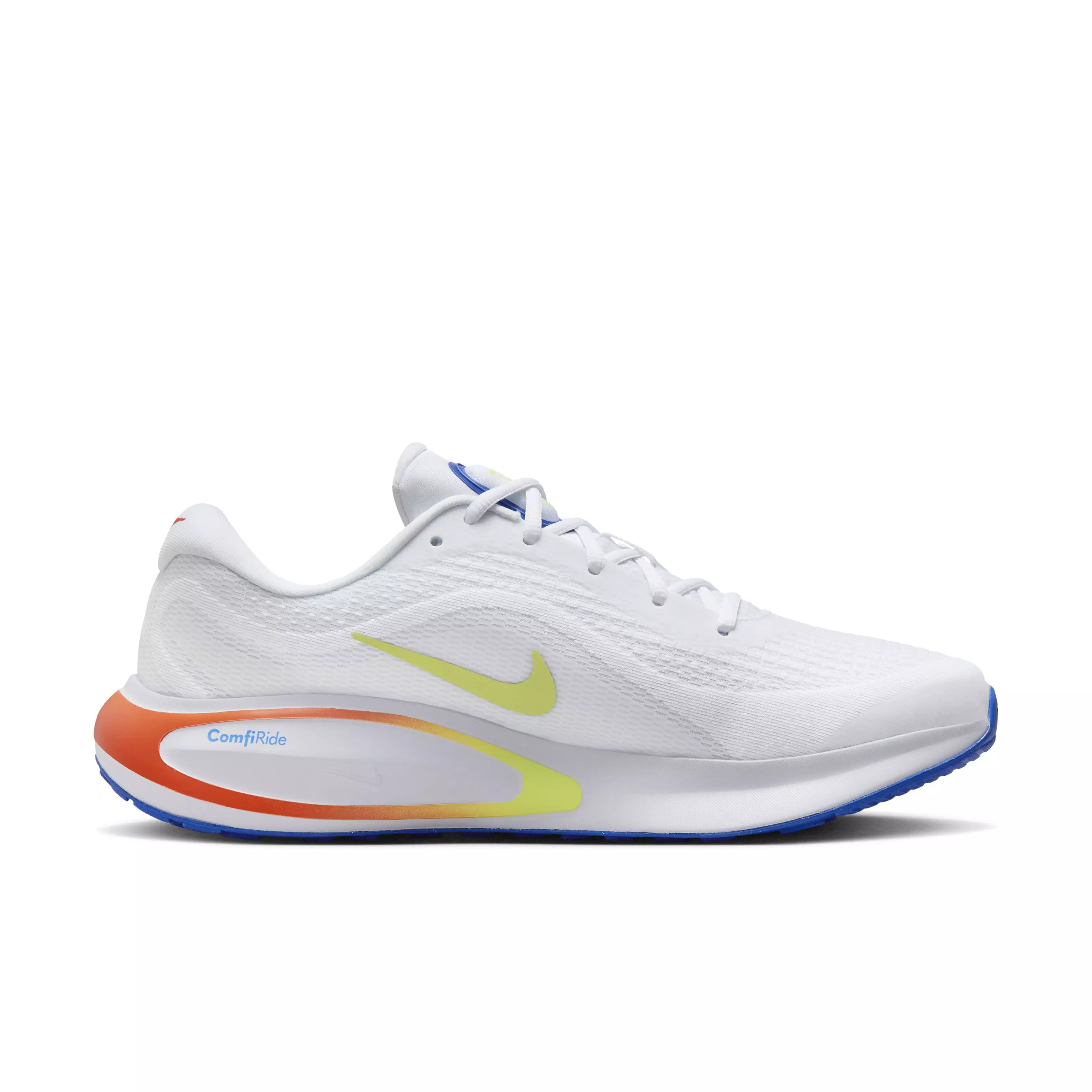 Enjoy every step, route and jaunt in the Nike Journey Run "Football Grey/White/Light Wild Mango/Racer Blue" Men's Running Shoe. It’ll have you striding and smiling on punishing pavements, thanks to extra-high foam stacks supersoft ComfiRide cushioning. It's so comfortable that you'll already be looking forward to lacing 'em up again.