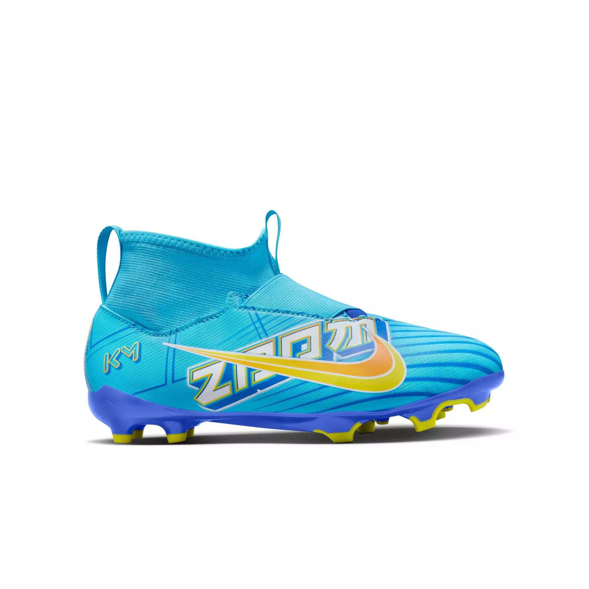 Play fast, play relentless and feel like superstar Kylian Mbappé on the field with the Nike Jr. Kylian Mbappe Mercurial Zoom Superfly 9 Academy FG/MG "Baltic Blue/White" Grade School Boys' Soccer Cleat. You've got the skills and the game, now slip these on quick—no laces needed—and show them off. Our first-ever Zoom Air unit made for soccer brings extra comfort and bounce to play on everything from real to artificial grass fields. With a stamp of approval from one of the world's best, who's ready to sub in?