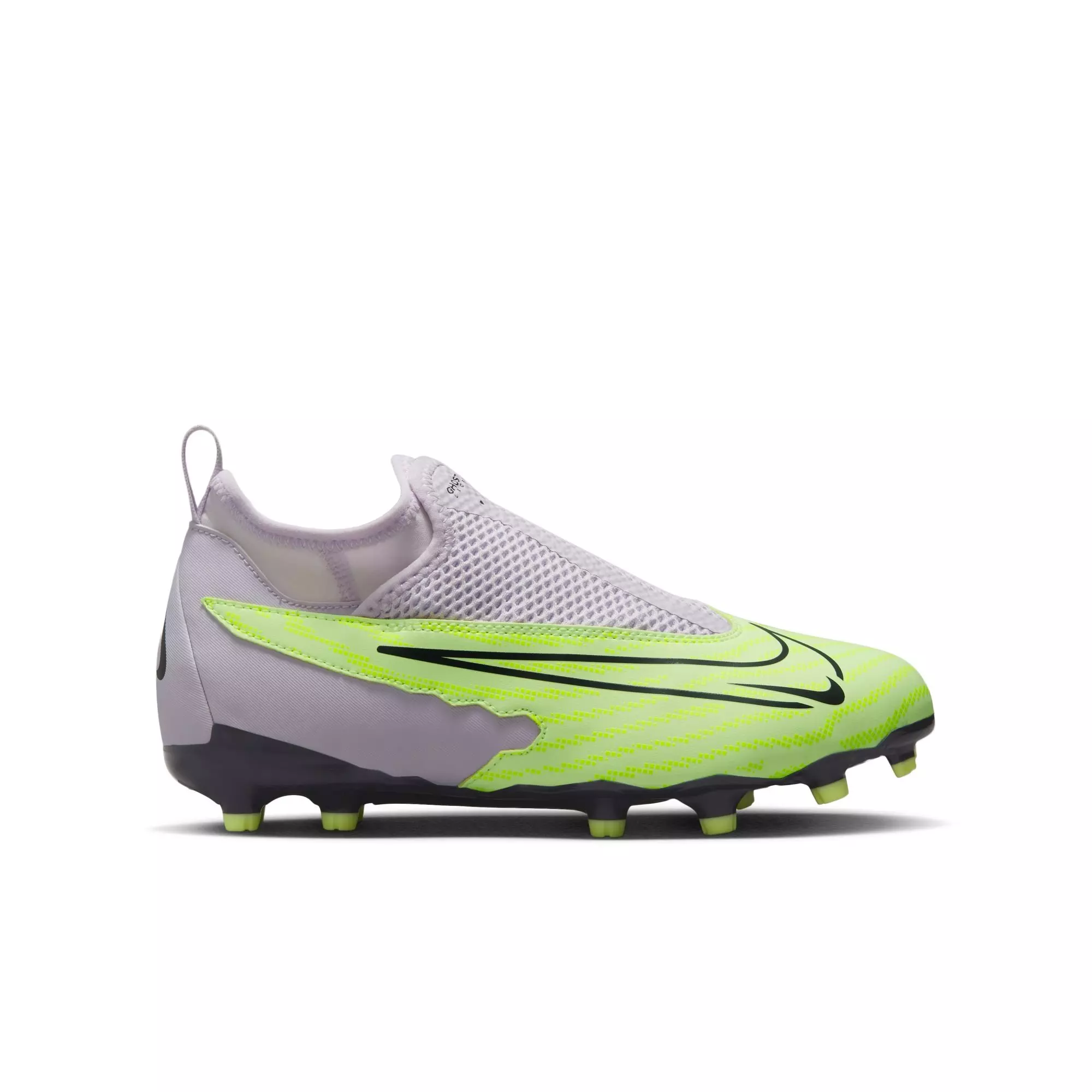 Looking to take your game to the next level? Nike Jr. Phantom GX Academy Dynamic Fit MG "Volt/Gridiron/Barely Grape" Grade School Kids' Soccer Cleats give you the precision touch you need to let your innermost playing instincts dazzle. Featuring NikeSkin and a mesh touch zone to help enhance your precision and an agility plate that’s designed to swerve and sprint with you, it’s ready to ignite your spontaneous playmaking spirit. Even better, there’s no need to tie these! Use the pull tabs and the adjustable tongue to slip these on and play sooner. Also, our ghost lacing system covers your laces for a cleaner cleat-to-ball connection. This version has a Dynamic Fit collar, which wraps your ankle in soft, stretchy fabric for a secure feel.Features