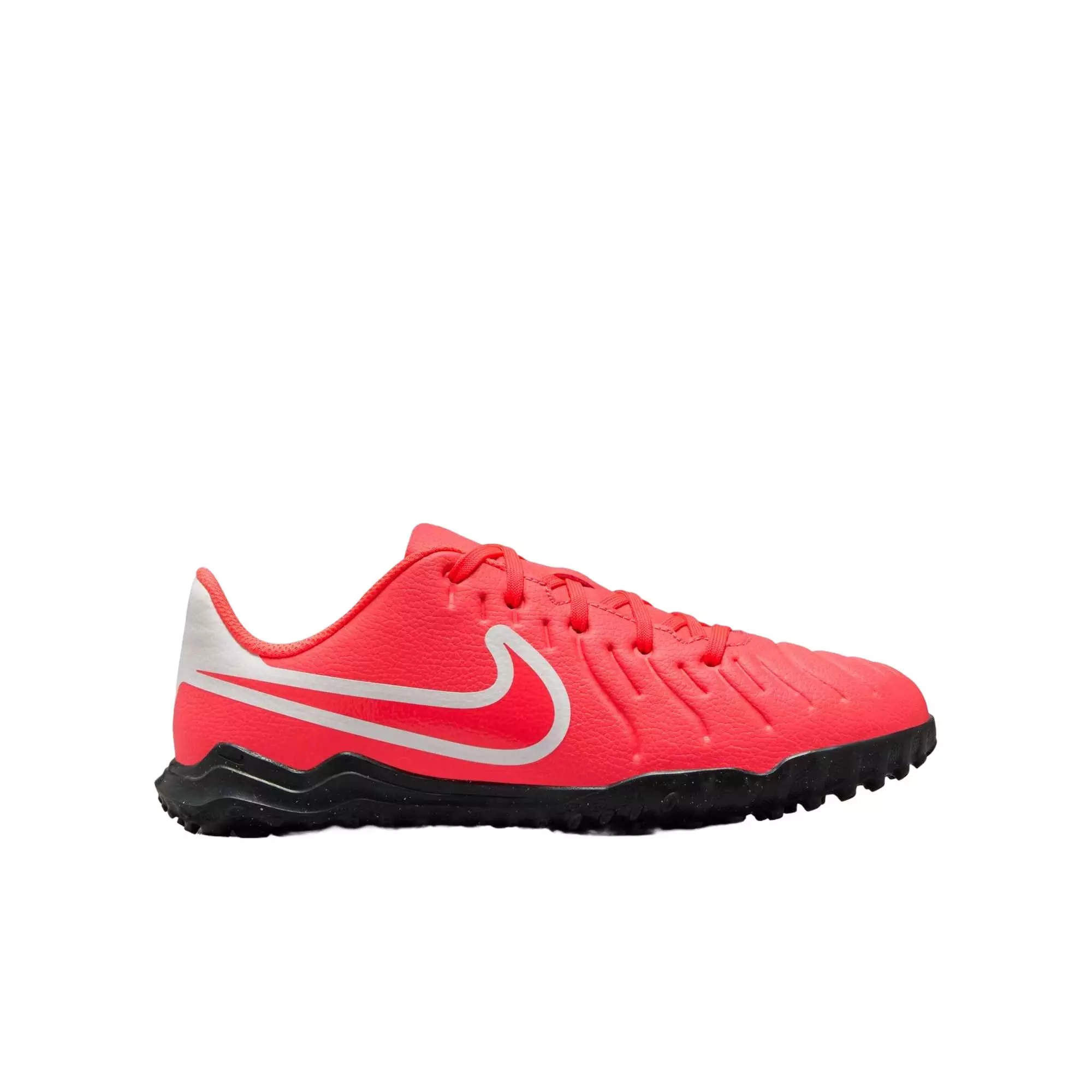 The Nike Jr. Tiempo Legend 10 Club Turf "Hot Lava/White" Grade School Kids' Soccer Shoe supports growing skills with a soft, durable synthetic leather upper that molds to the foot without overstretching for precise touch. Built for turf play, it delivers dependable grip and comfort from kickoff to the final whistle.