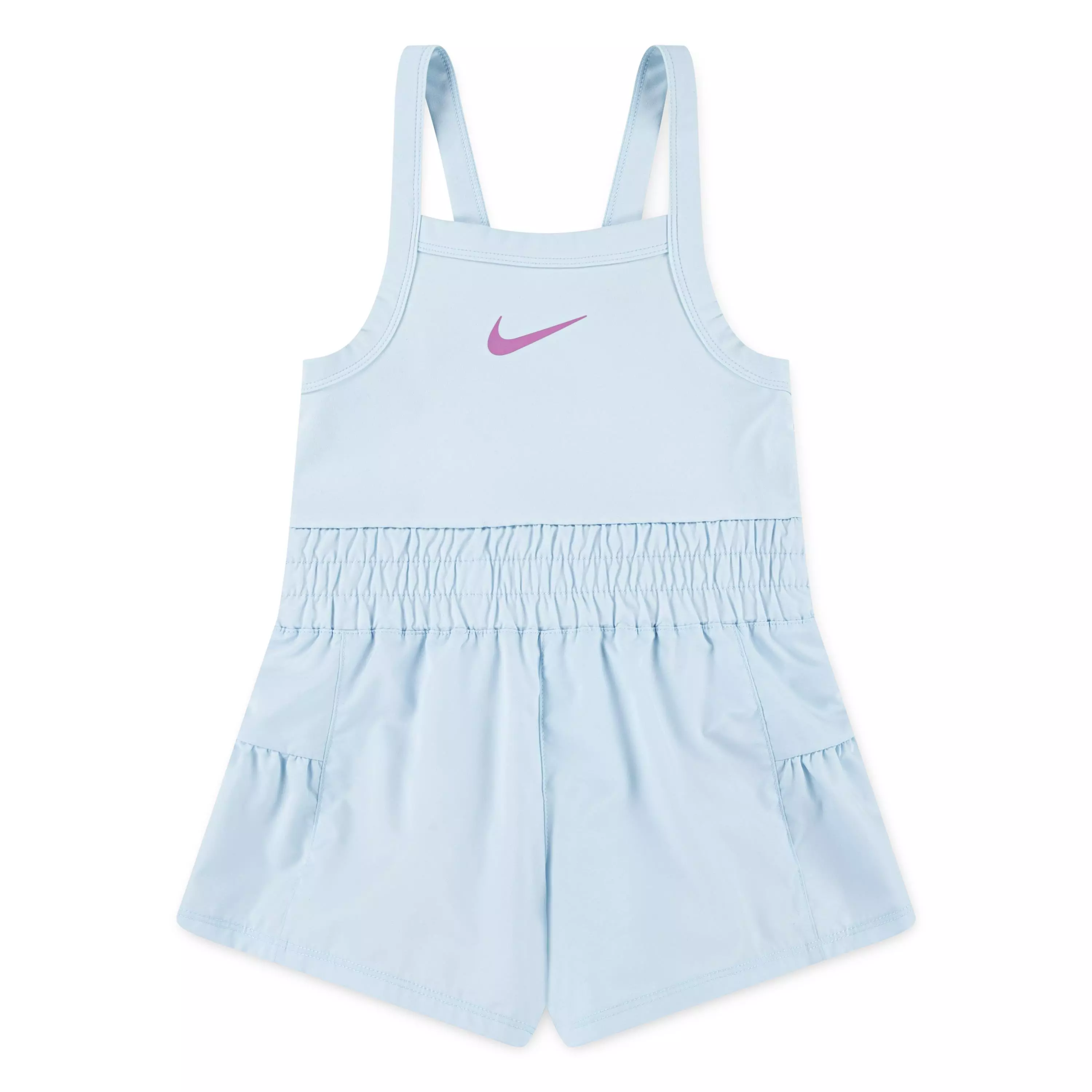 This Nike Little Girls' Sunny Swoosh Runsie Romper uses stretch knit fabric with Dri-FIT technology to quick-dry sweat and wick moisture away. It keeps little ones cool, dry and comfortable during play.