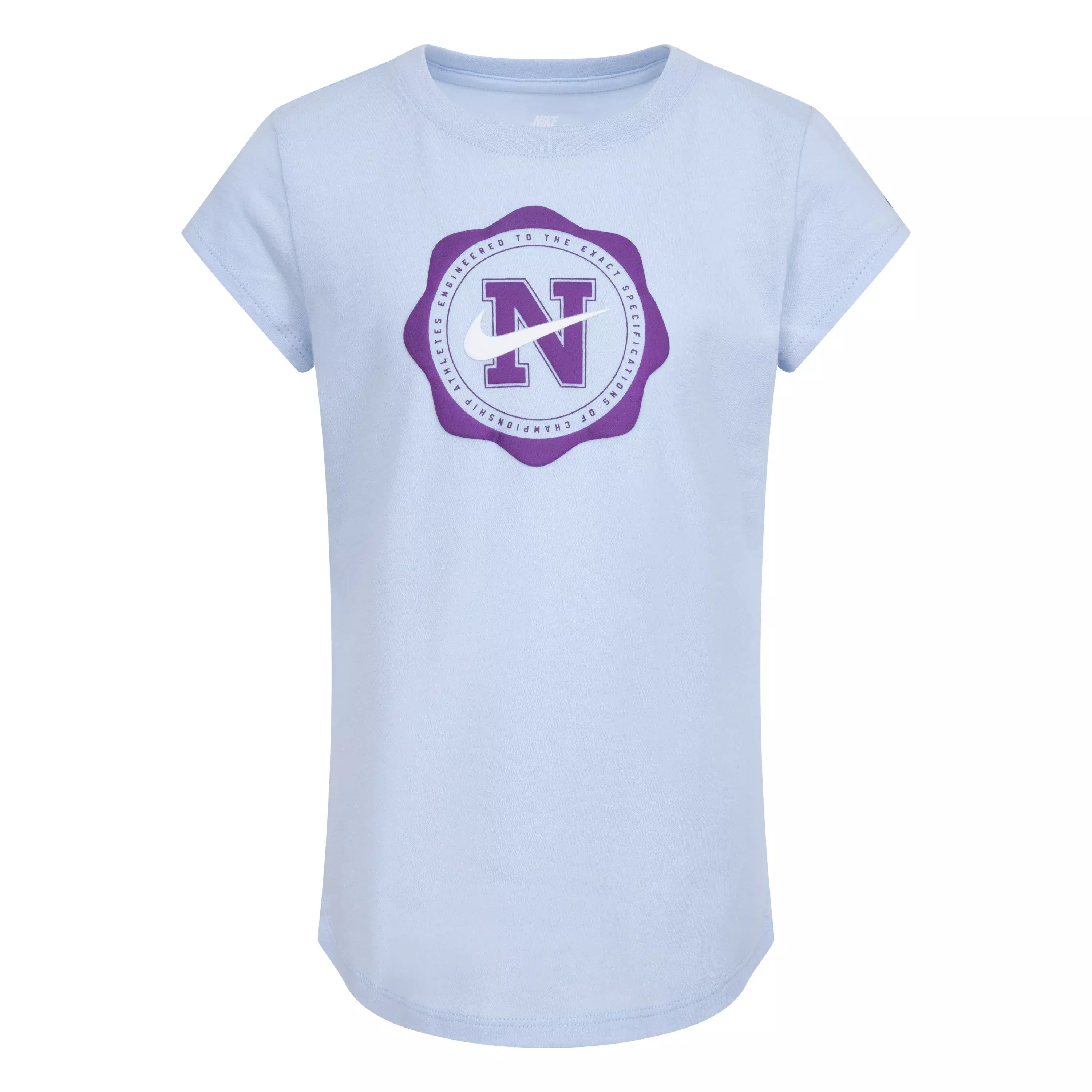 The Nike Little Girls' Pep Tee - Light Blue/Purple features 100% soft cotton in a classic T-shirt silhouette. Soft cotton feels gentle against skin and stays breathable through movement. Its design highlights purple accents paired with a light blue hue.