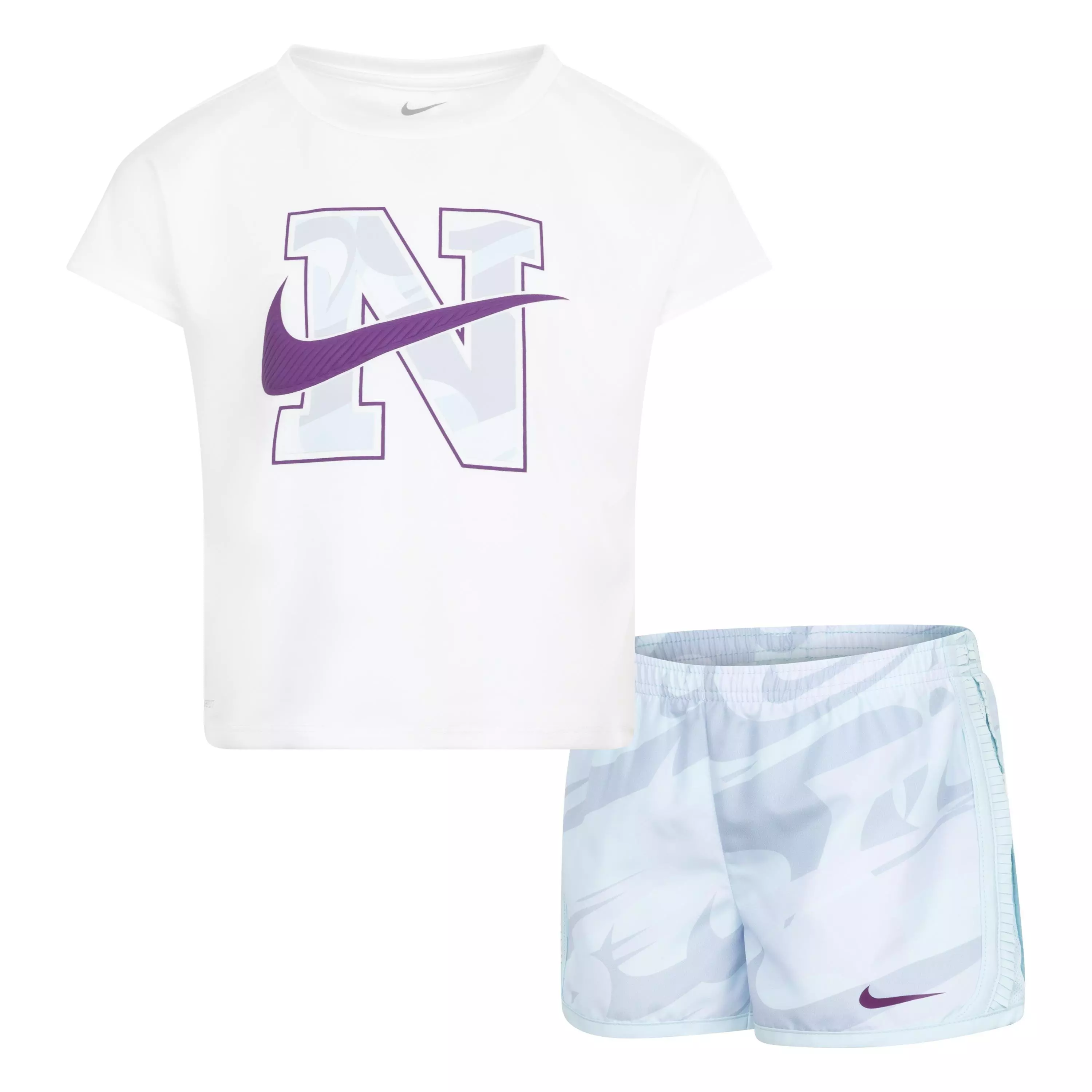 This Nike Little Girls' Tempo Dri-FIT Prep Set was designed to put a little extra pep in your kiddo's step! The tee is made of knit fabric with short dolman sleeves and a flowy boxy cut for a relaxed fit with a flattering cropped look. The matching shorts are made of lightweight woven fabric, have an encased elastic waistband for a comfy fit and a built-in liner providing full coverage during every run, jump and skip. Additionally, both pieces are enhanced with quick-drying, moisture-wicking Dri-FIT technology to keep kiddos cool and dry while they play. Ready, set, GO!Features
