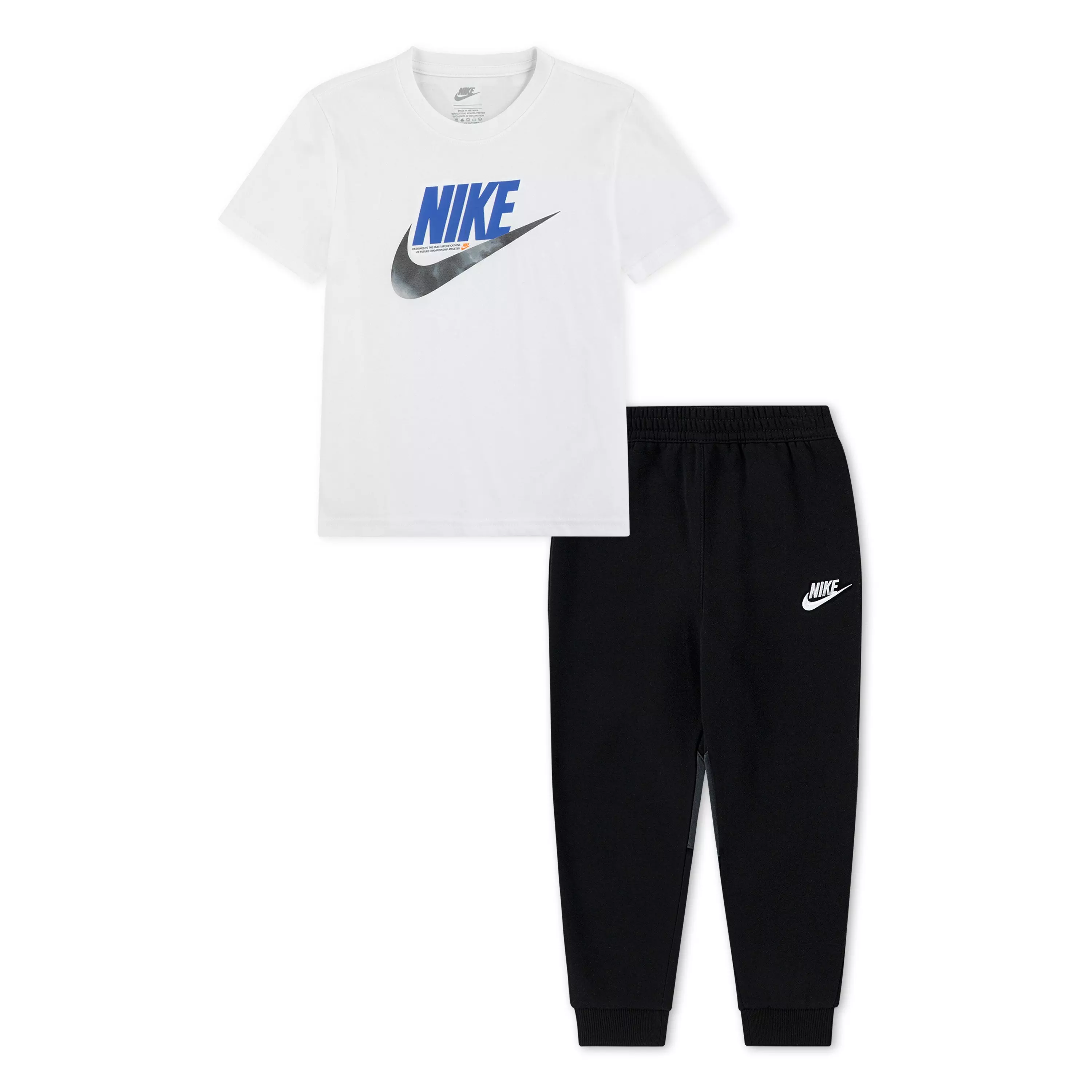 Get your little one ready for play in the Nike Little Kids' FS Tee and Fleece Pants Set. Soft cotton/poly knit keeps them comfy; the tee combines a textured body with smooth sleeves, a tagless crewneck, and dropped shoulders for easy movement.