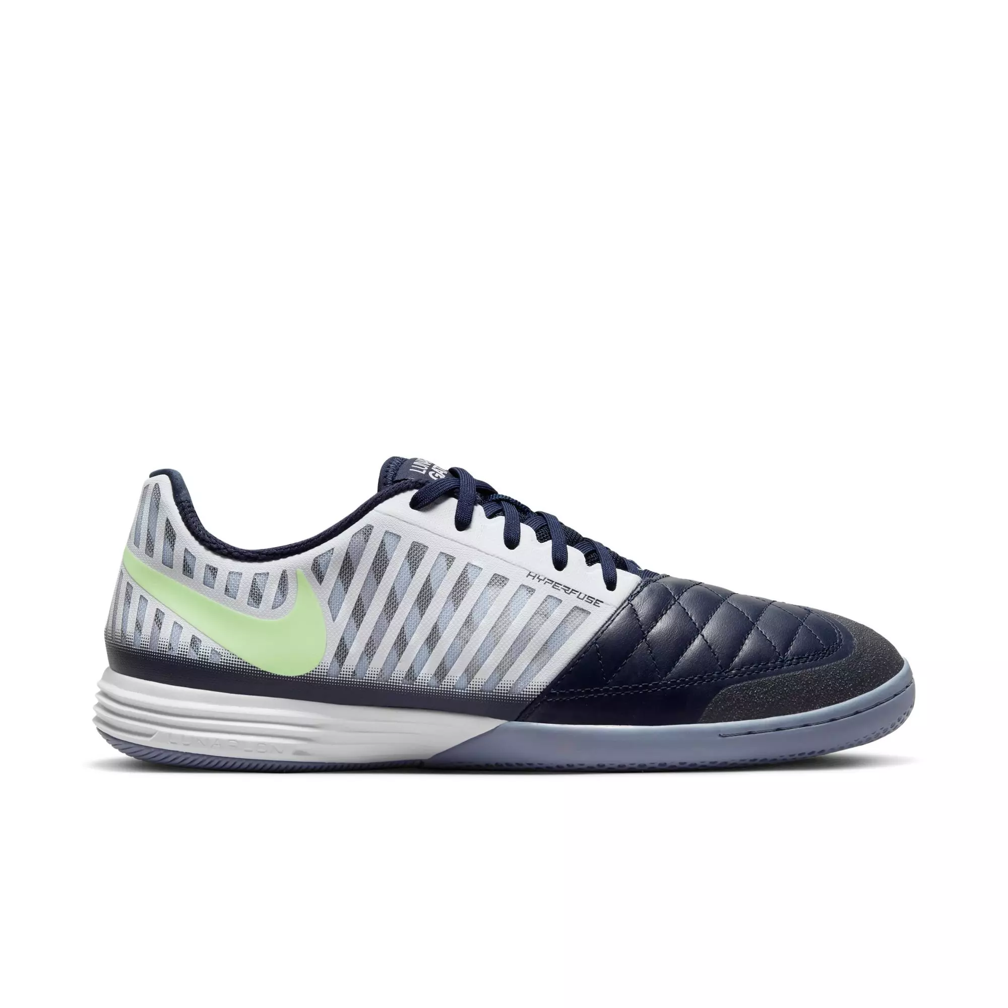 The Nike Lunar Gato II IC "White/Barely Volt/Blackened Blue" Men's Indoor Soccer Shoe is ideal for the small-sided game. Soft leather at the forefoot has a smooth, natural feel for precision strikes. Lunarlon cushioning feels springy and responsive, while rubber tread gives you traction for quick cuts on indoor surfaces.Features