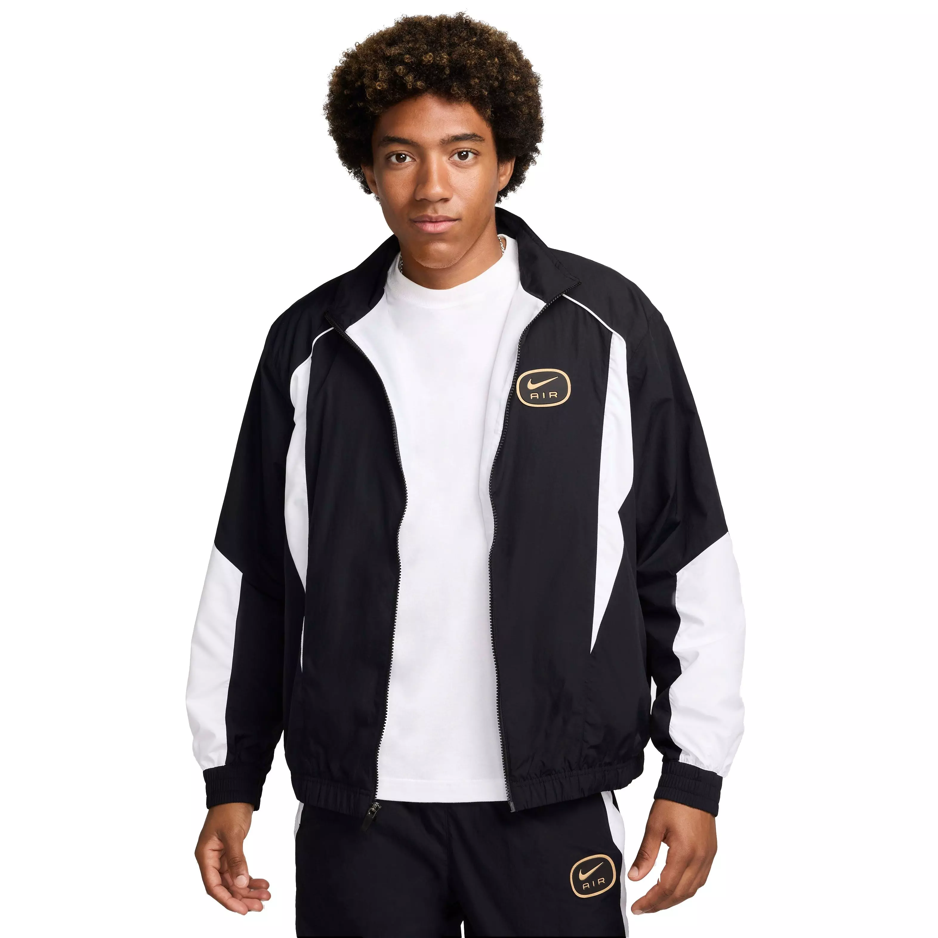 A loose fit and full-length zipper make this lightweight Nike Men's Air Woven Track Jacket - Black/White a layering essential. Crinkled taffeta adds a throwback feel, while ripstop panels on the elbows add durability.Features