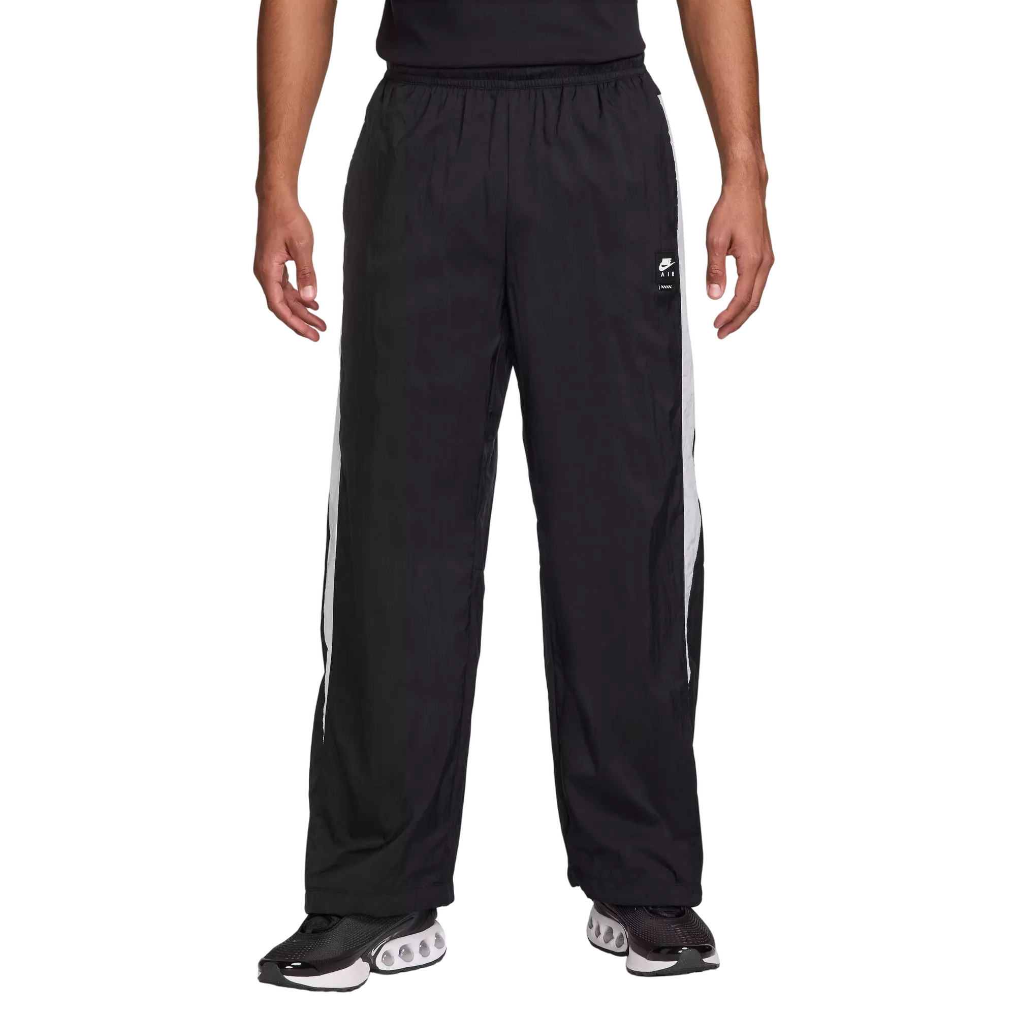 Dial up your casual attire with the Nike Men's Air Woven Track Pants, designed with a roomy straight-leg silhouette and a relaxed fit for everyday ease. A smooth, lightweight woven fabric delivers a soft swish feel and repels light moisture, while an elastic waist secures comfort through your day.