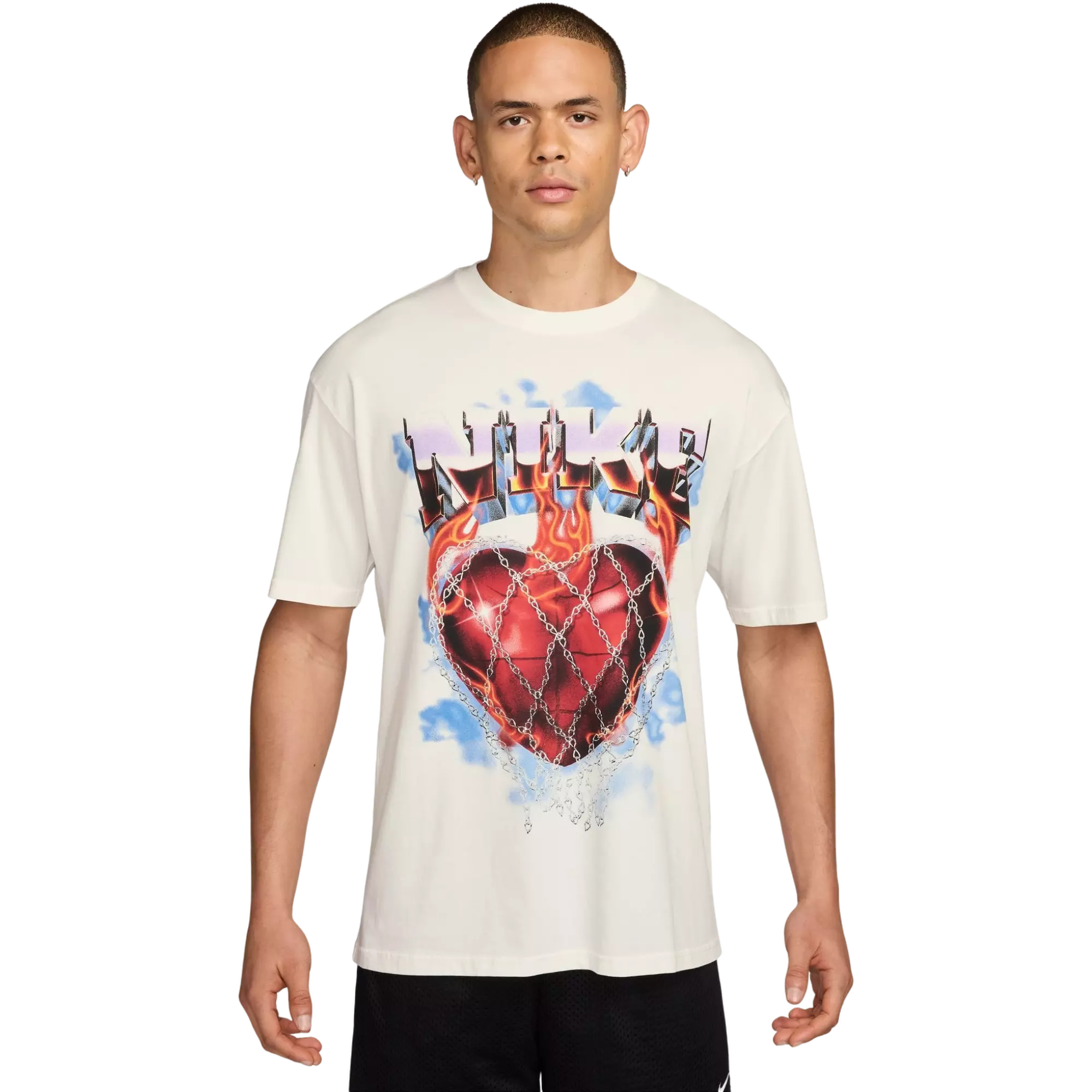 Show your love for the game in the Nike Men's Basketball Tee-Sail. Inspired by the sound of a swish through a chain net, this relaxed Max90 tee features dropped shoulders and longer sleeves for easy movement on and off the court.
