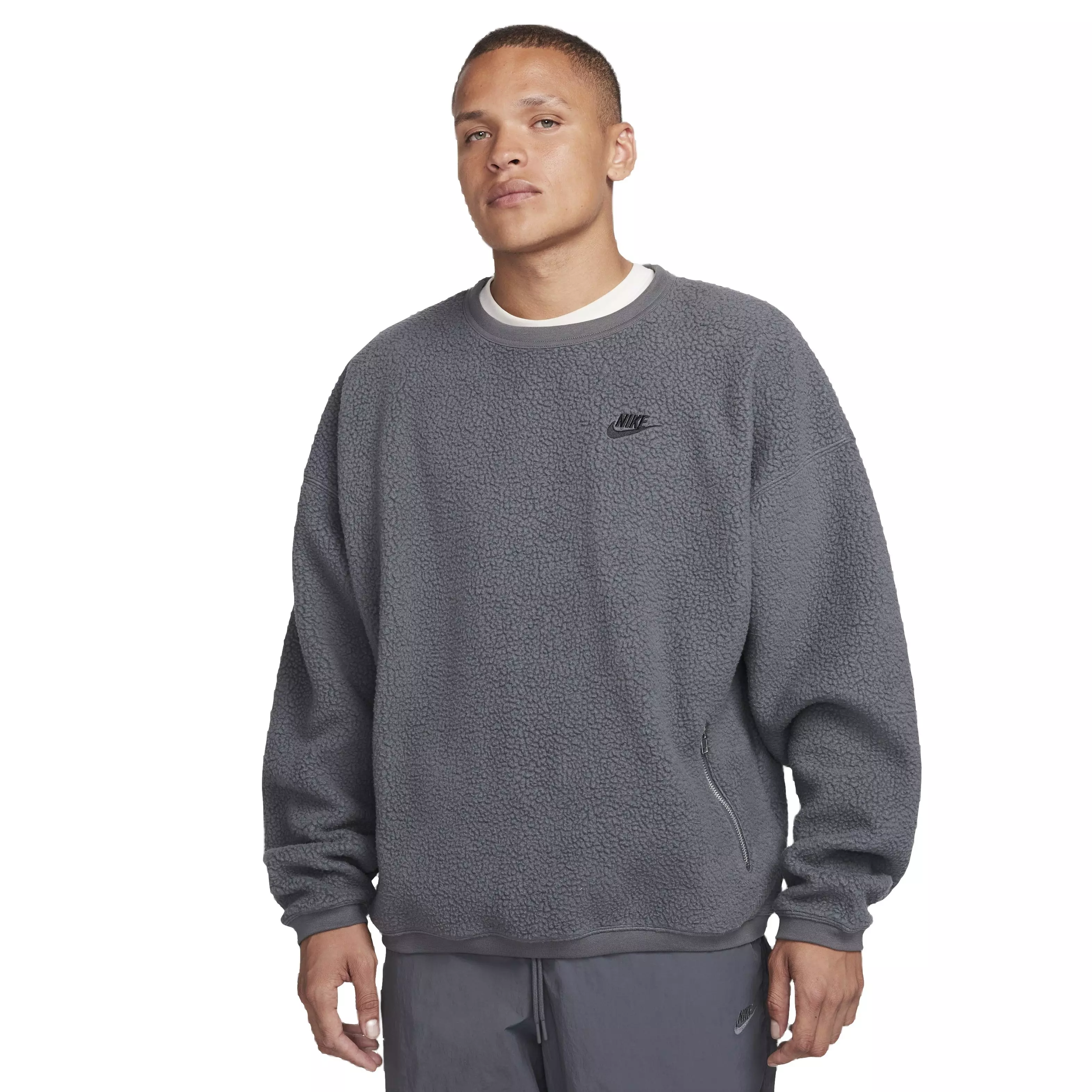 Stay warm when temperatures drop in the Nike Men's Club Fleece Sherpa Winterized Crew, built for cozy comfort during cold-weather commutes or casual days out. Its plush sherpa fleece and roomy silhouette make layering easy, while ribbed trims help seal in heat.