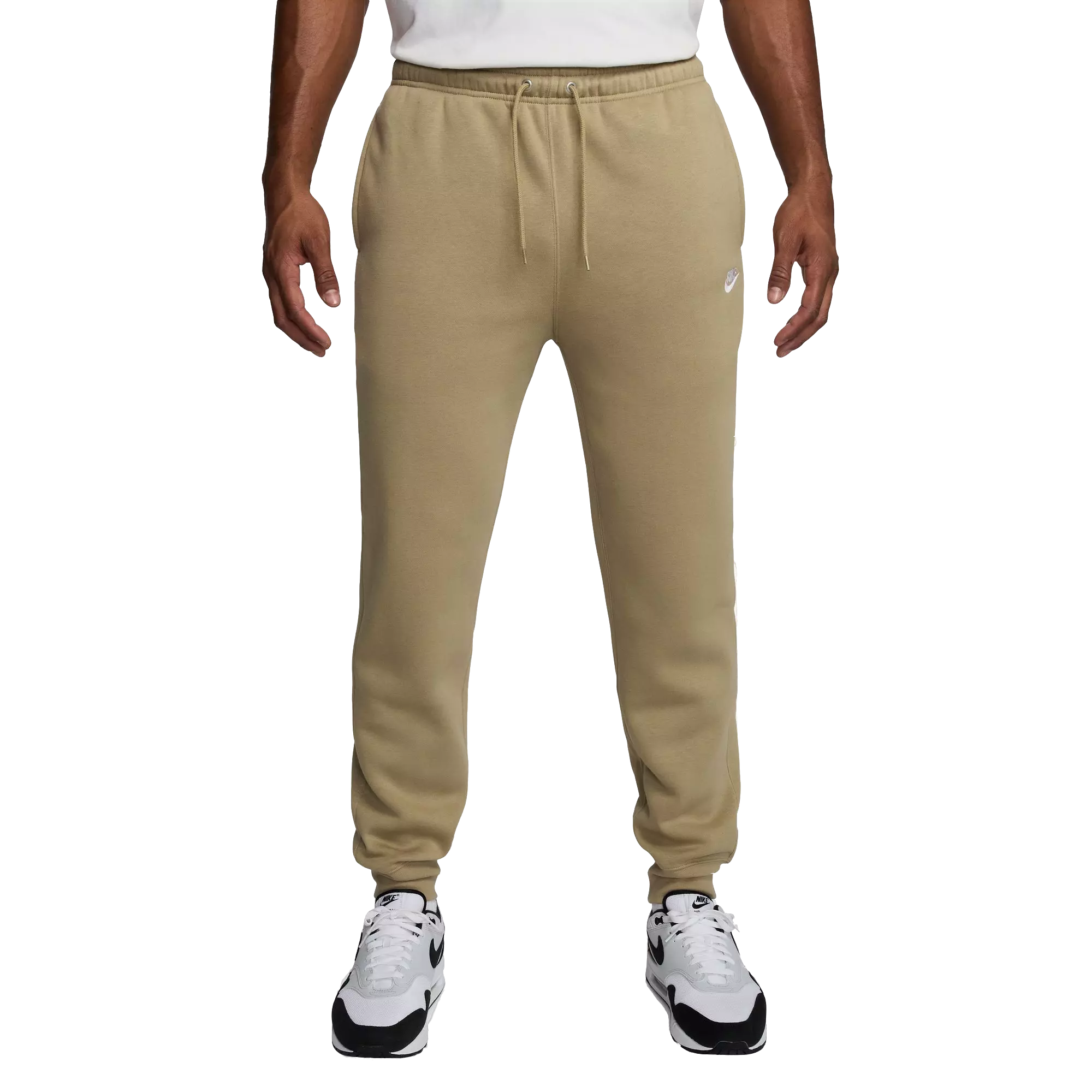 The Nike Men's Club Joggers-Beige includes an elastic waistband and ribbed cuffs to secure a tapered fit and support unrestricted movement. Low-profile design enhances versatility. Soft fleece lining retains warmth during cooler temperatures.