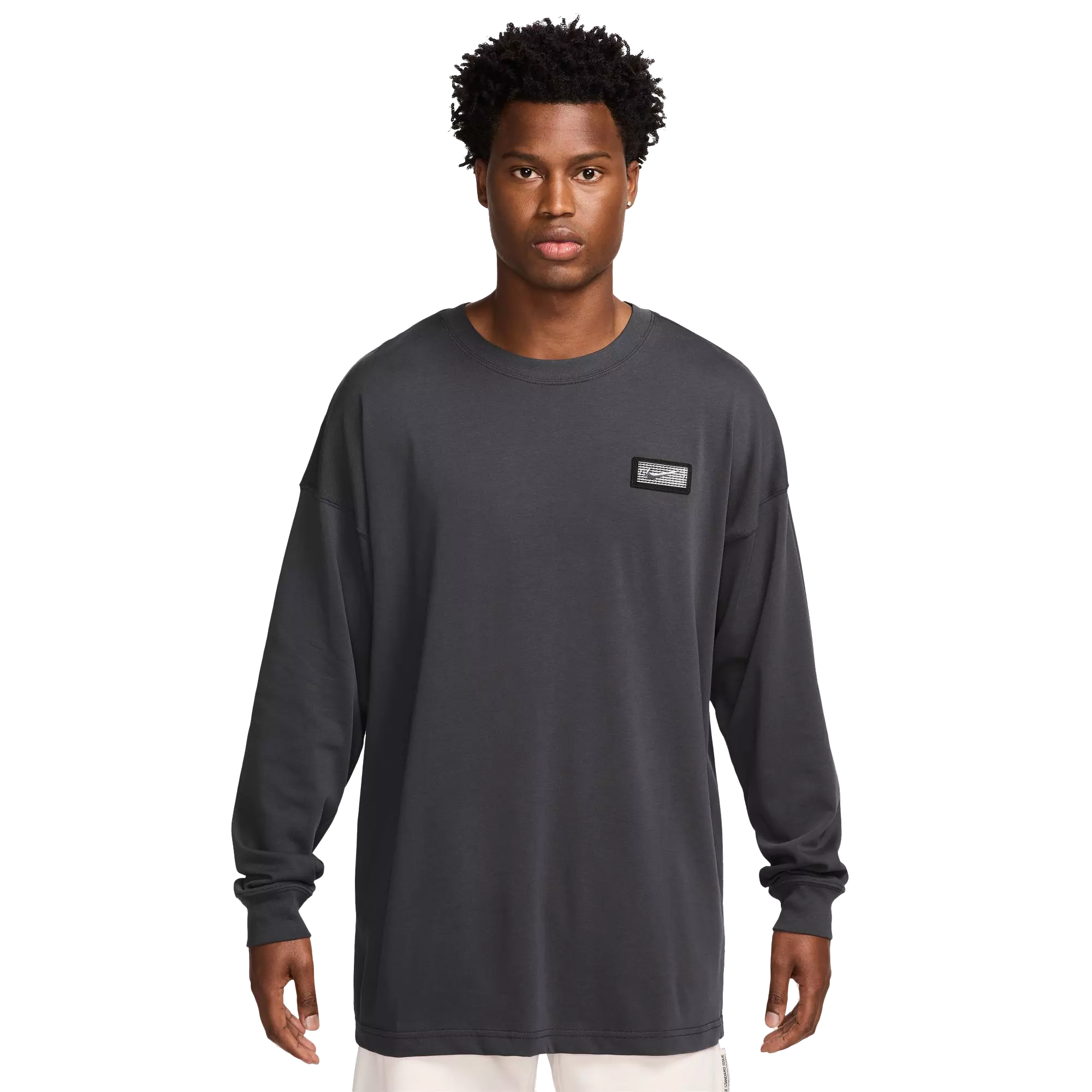 The Nike Men's Devin Booker Long-Sleeve Basketball Tee-Black features a distinctive oversized fit, embroidered graphics and soft heavyweight cotton that delivers a structured feel, turning heads much like Booker's game.