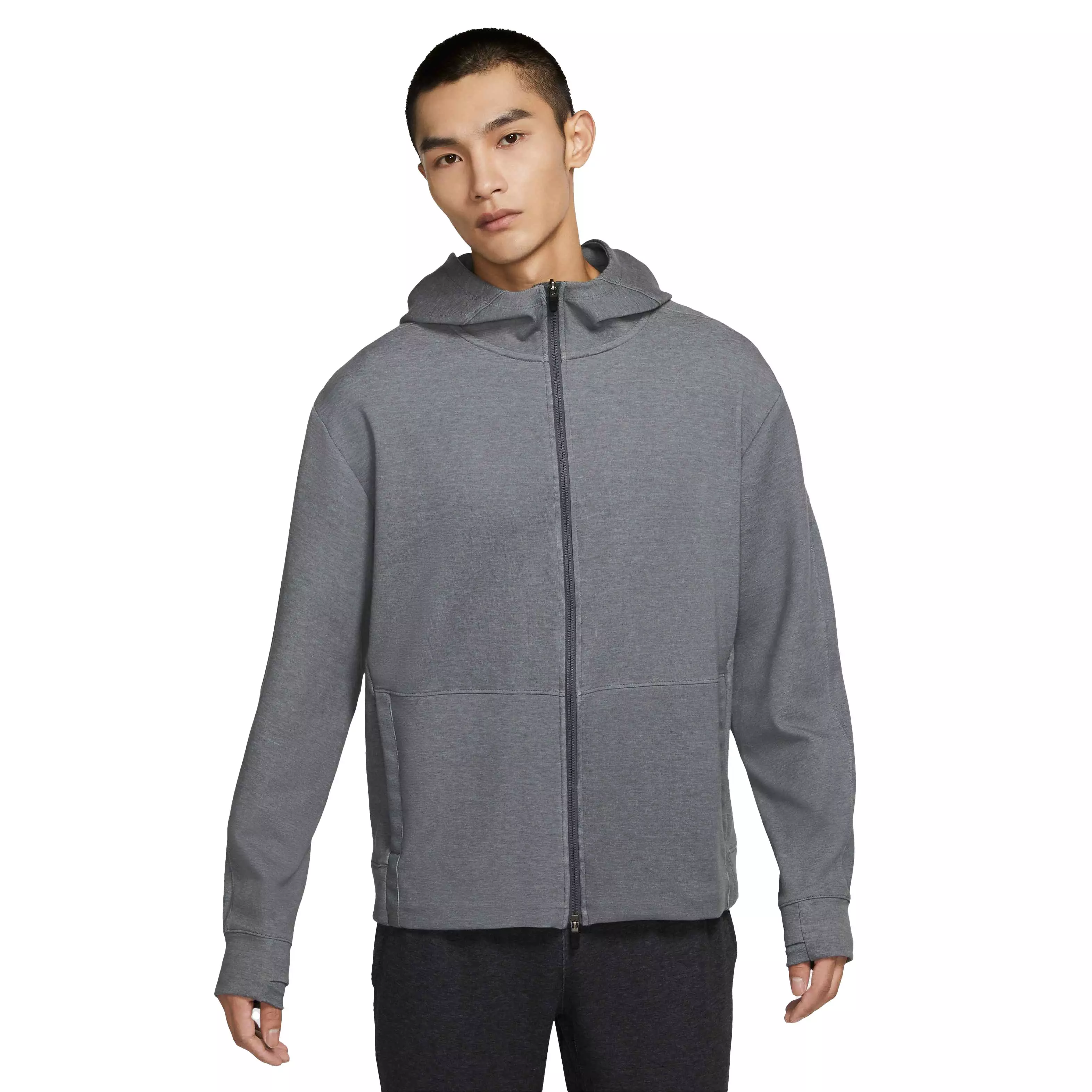 The Nike Men's "Grey" Dri-FIT Fleece Full-Zip Yoga Hoodie gives you soft, lightweight coverage that stretches and wicks sweat while you warm up or cool down on the mat. Thumbholes keep it streamlined as you move. This product is made with at least 75% sustainable materials, using a blend of both recycled polyester and organic cotton fibers. The blend is at least 10% recycled fibers or at least 10% organic cotton fibers.