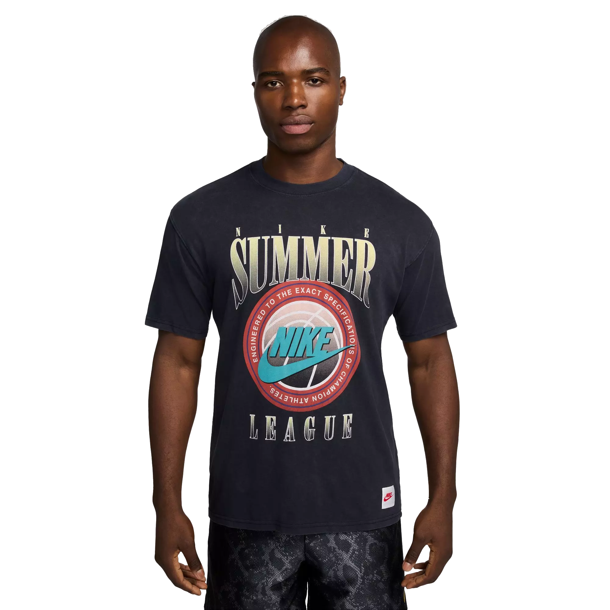 This soft midweight cotton Nike Men's Max90 Basketball Tee-Black features an elevated Max90 cut that delivers a roomy fit paired with a timeless silhouette. The durable weave maintains its shape through each wear.