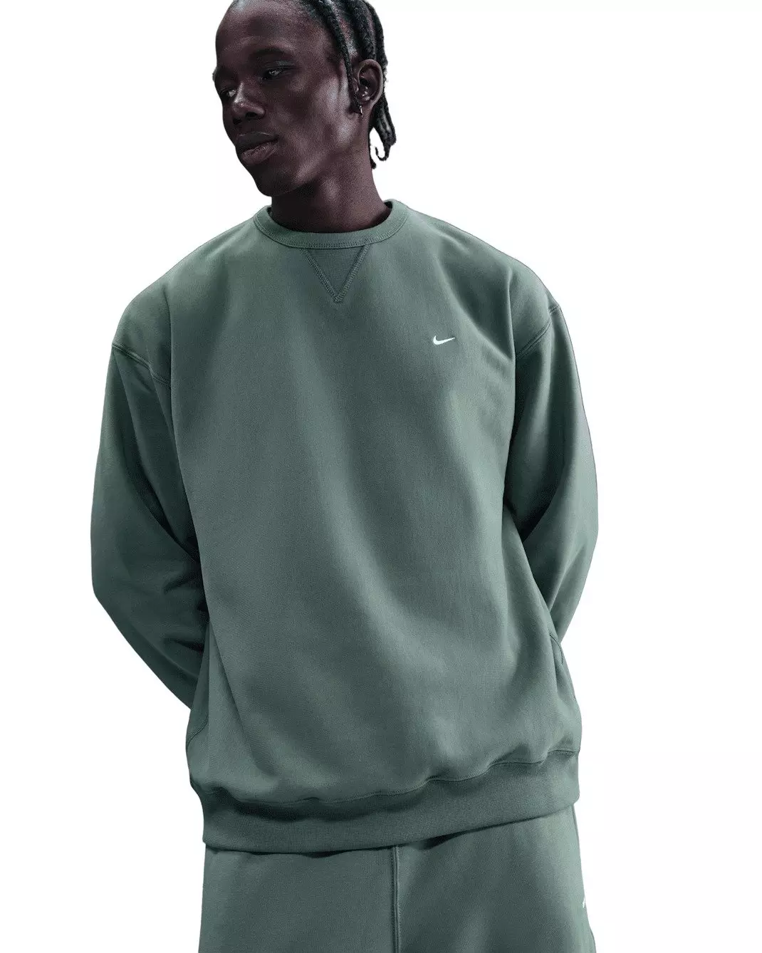 Warm and structured, this Nike Men's Solo Swoosh Fleece Crew is crafted with heavyweight brushed fleece that feels plush on the inside and smooth on the outside, bringing a touch of luxury to your casual, cool-weather layers. The loose fit feels roomy through the body.Features