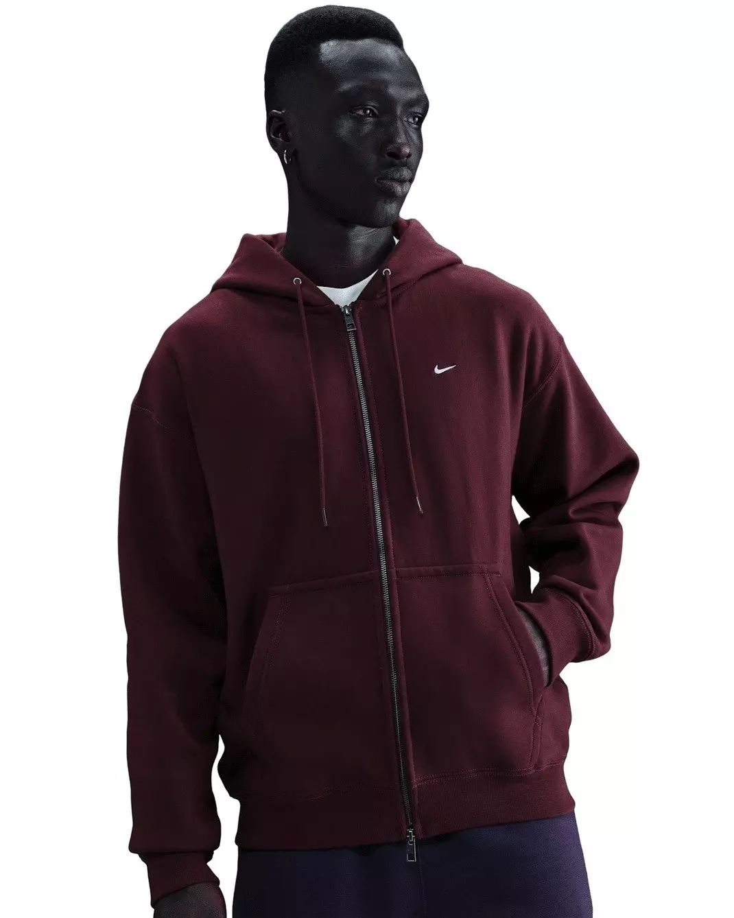 Bring a touch of luxury to your casual, cool-weather layers with this warm and structured Nike Men's Solo Swoosh Full-Zip Fleece Hooded Jacket. It's crafted with a heavyweight brushed fleece that feels plush on the inside and smooth on the outside.Features