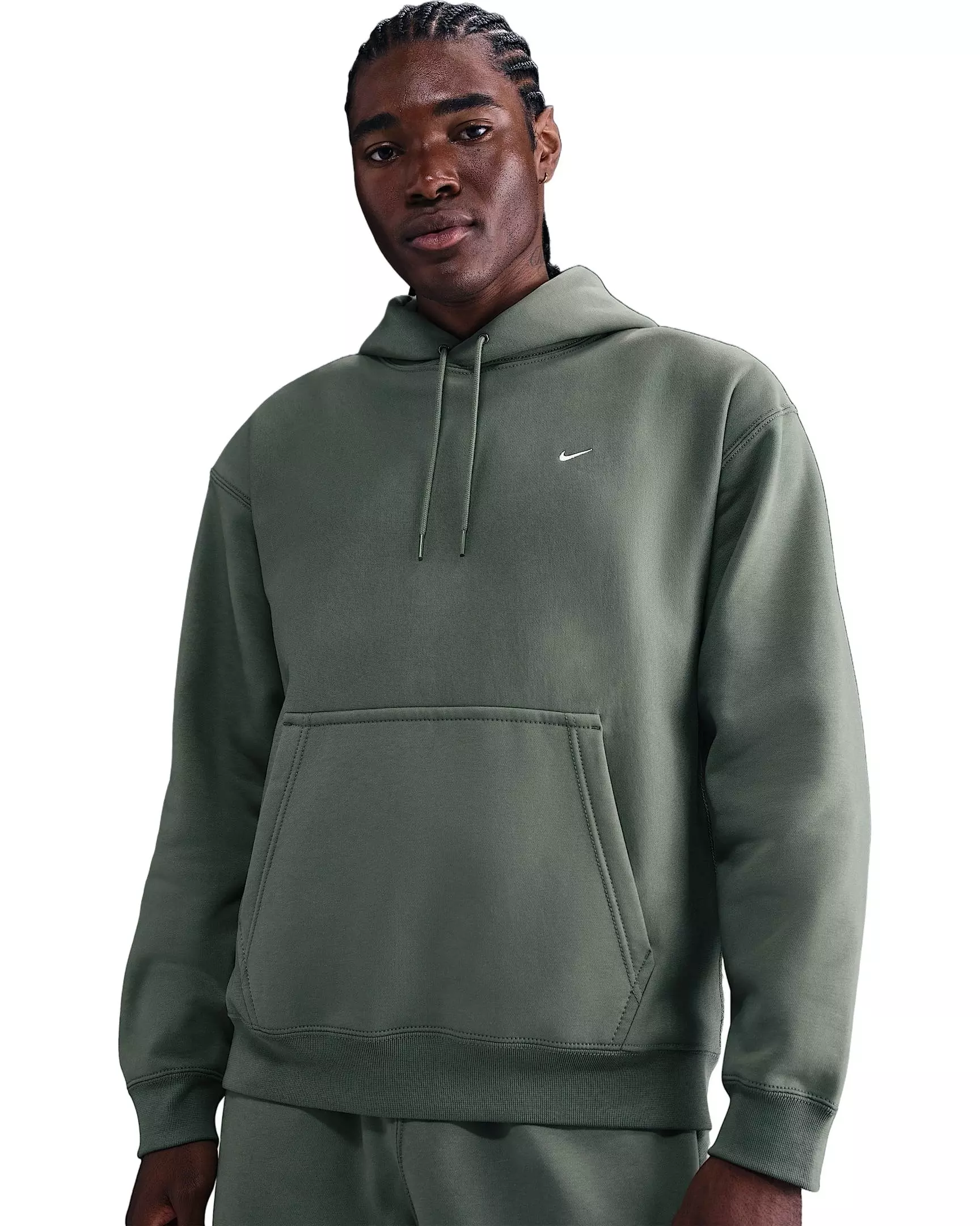 Stay warm in the Nike Men's Solo Swoosh Loose Fleece Pullover Hoodie, crafted with soft, brushed fleece and a relaxed fit through the shoulders, chest, and body for easy comfort. Thick, stretchy ribbing at the cuffs and hem helps hold its shape and seal in warmth when temperatures drop.An embroidered Solo Swoosh at the left chest keeps the look clean and timeless. A roomy hood and classic kangaroo pocket add everyday utility, making this an effortless layer for laid-back days, commutes, and cool evenings.