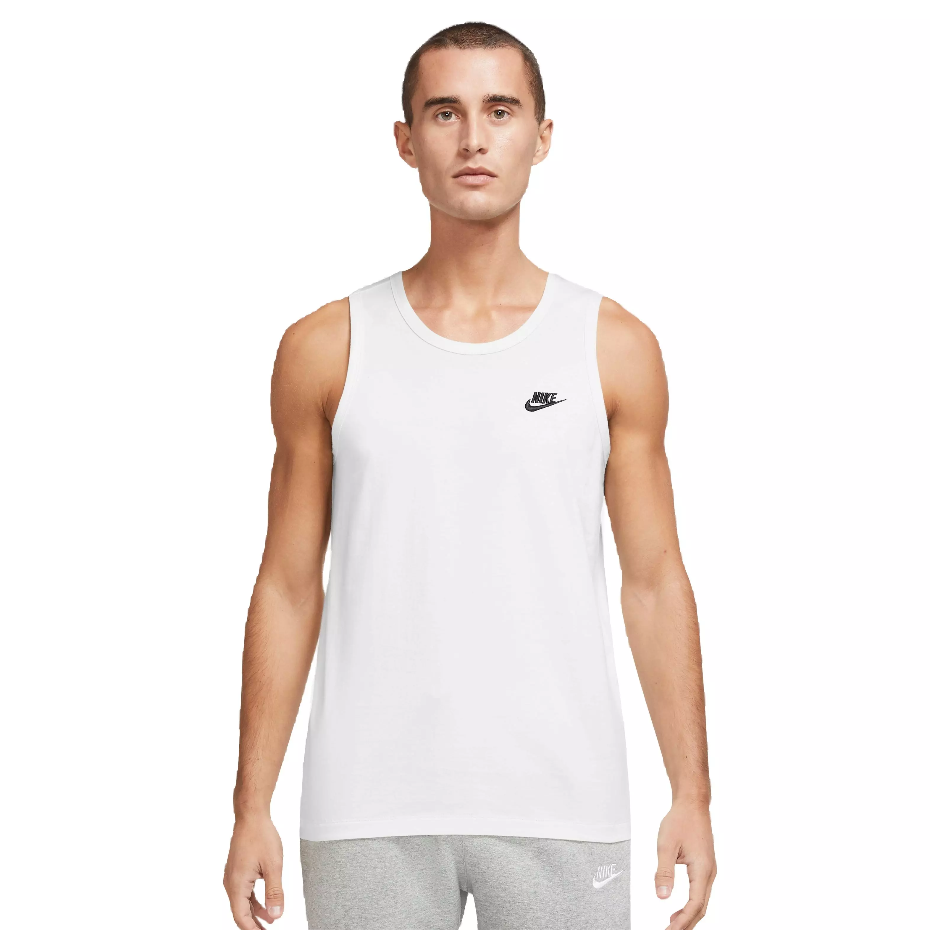 The Nike Men's Sportswear Club Tank-White features soft cotton jersey fabric that feels gentle against skin and maintains breathability in heat. Its sleeveless cut delivers a full range of motion and reliable airflow.