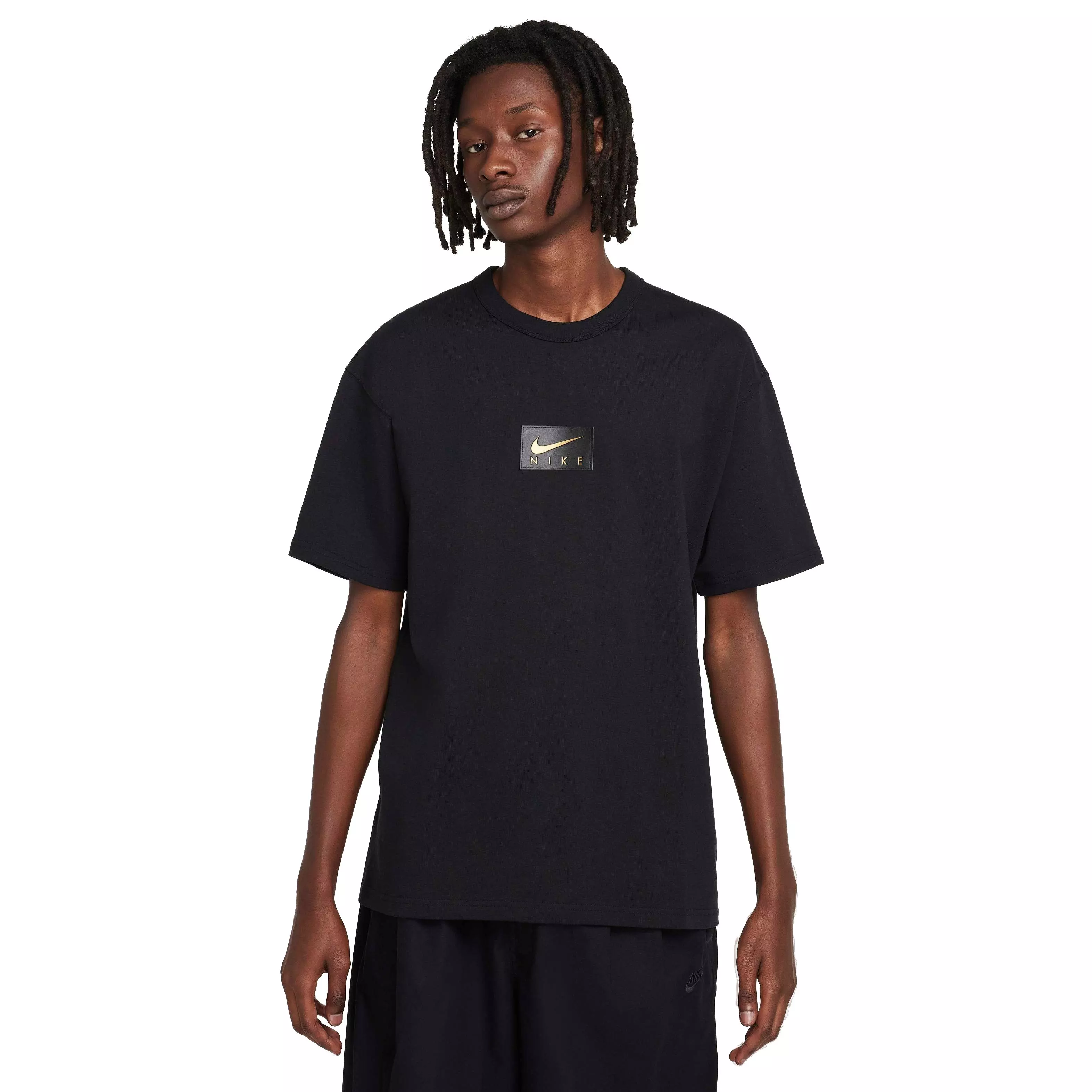 A faux-leather patch with a gold foil Swoosh logo makes a statement at the chest of this classic Nike Men's Sportswear M90 T-Shirt. Dropped shoulders, longer sleeves and a roomy fit through the body and hips give a relaxed and casual look. Rich, heavyweight cotton fabric has a stiff drape and structured feel.Features