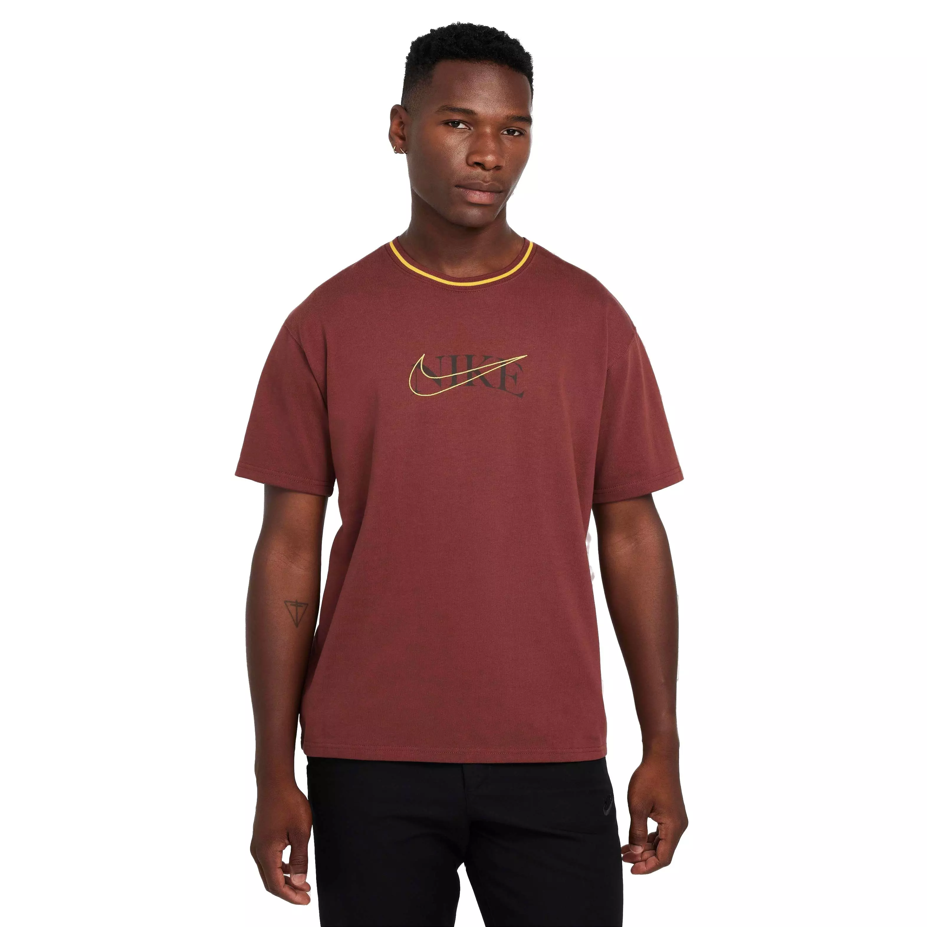 Heavyweight, high-density cotton, chain-stitched embroidery, and a striped collar enhance the look of this classic Nike Men's Sportswear Max90 Tee. Dropped shoulders, longer sleeves, and a roomy fit through the body and hips give this Max90 tee a relaxed, modern feelFeatures